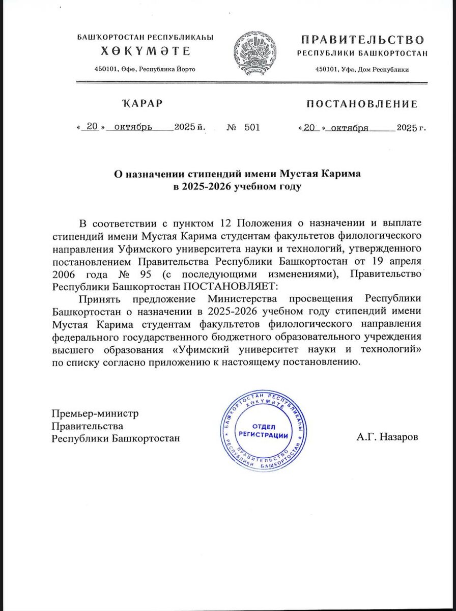 Премьер-министр Правительства республики Андрей Назаров утвердил соответствующие распоряжения, направленные на поощрение талантливой молодежи. Эти меры призваны мотивировать студентов к дальнейшему углубленному изучению башкирского языка и литературы, а также к активному участию в научной и творческой жизни региона.