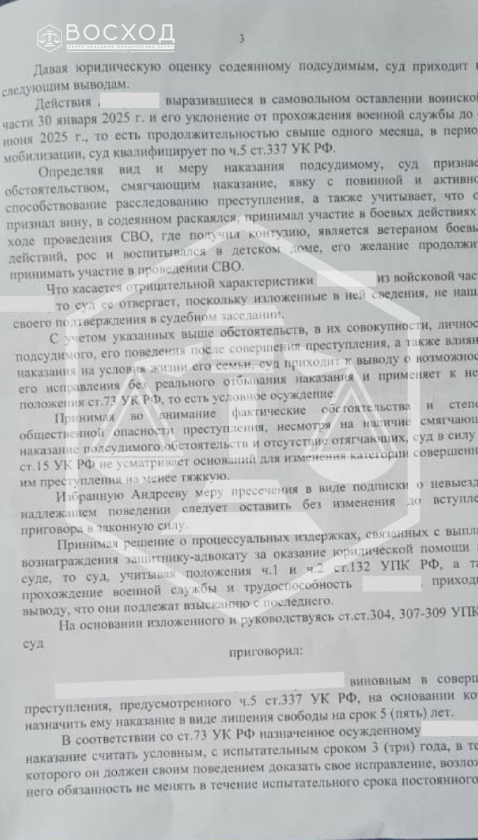Представьте: военнослужащему, ветерану СВО с контузией, грозил реальный срок — 5 лет колонии. Прокуратура настаивала на строгом наказании по ч. 5 ст. 337 УК РФ, но мы смогли доказать, что даже в самой сложной ситуации важно видеть человека, а не просто статью. Что было против него: Что мы сделали, чтобы защитить его: Сразу выстроили линию защиты, основанную на смягчающих обстоятельствах: