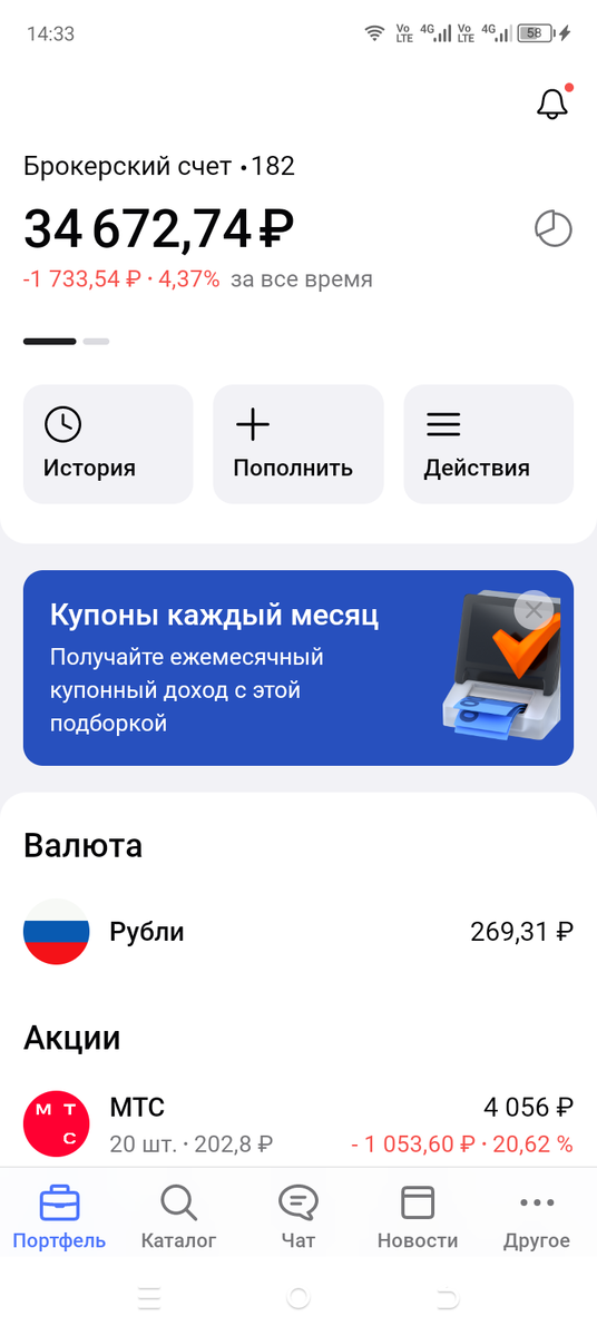 Всем доброго времени суток! Я продолжаю двигаться к своей цели выйти на денежный поток в размере 10-15 тысяч рублей в месяц, поэтому каждый месяц я покупаю дивидендные акции. Пополнил счёт на 2900₽ и приступил к планомерной закупке. Во вторую неделю октября было куплены акции: Газпром нефть Татнефть Новабев. На третьей неделе октября докуплены: Татнефть Газпром нефть Роснефть. В текущий момент ситуация на фондовом рынке депрессивная. Мой портфель показывает убыток в 4%. Именно поэтому я вкладываю только те деньги, которые готов потерять. Благодаря произошедшему, я собственным опытом понял почему опытные инвесторы покупают еженедельно активы. Средняя цена покупки теперь составляет : Газпром нефть 552,69₽ Татнефть привилегированная 558,67₽ Новабев 389,16₽ Роснефть 503,08₽. Всем всего наилучшего а буду дальше докупать активы по возможности.