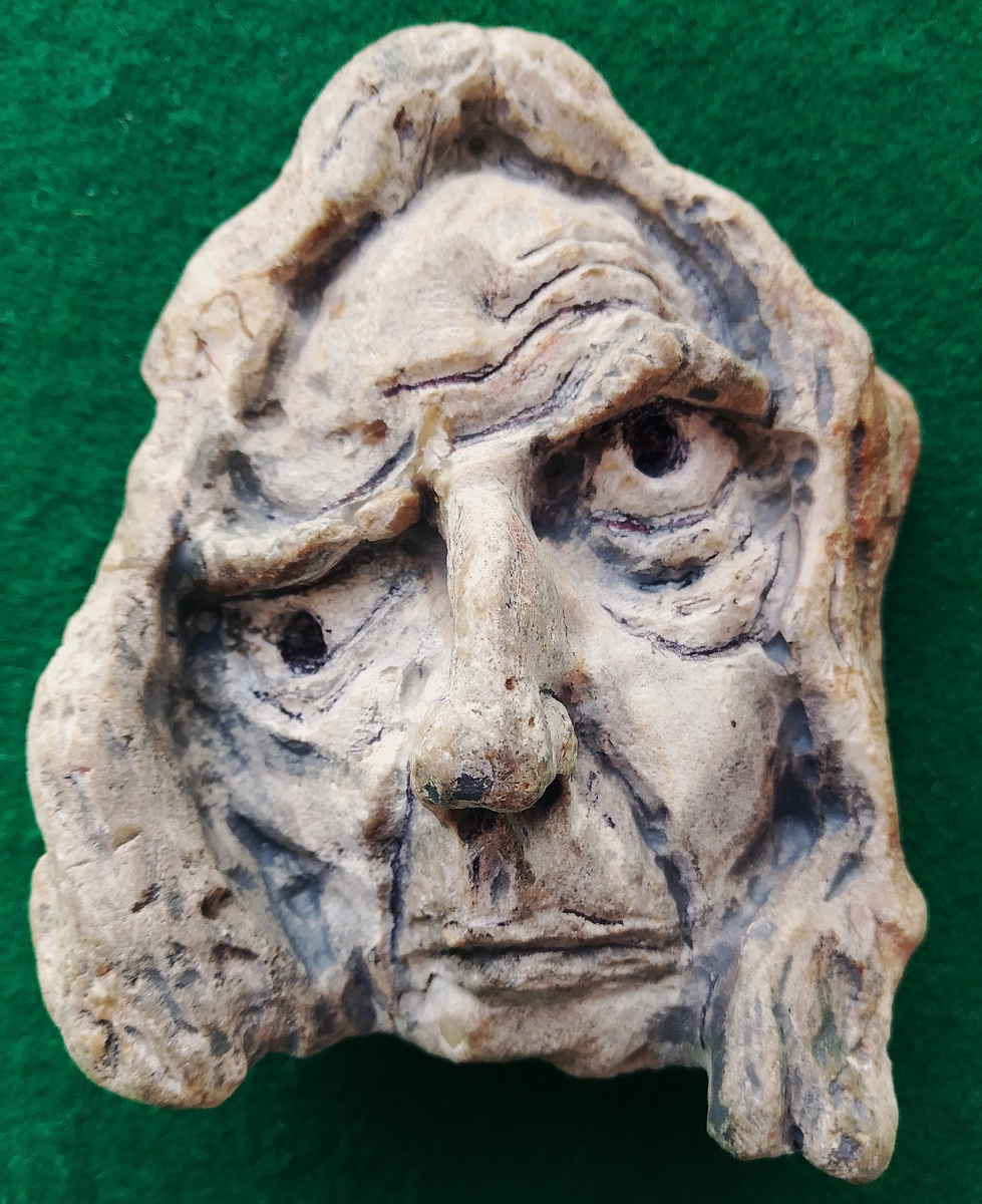 Однажды я нашел камешек, в котором узнавалось слегка перекривленное лицо. Я задумался - кого же оно мне напоминает? Решил, что после определенной доработки, получится лицо лапутянина - удивительного персонажа описанного английским писателем Джонатаном Свифтом в третьей части его книги с очень длинным названием: “Путешествия в некоторые отдаленные страны света Лемюэля Гулливера сначала хирурга, а потом капитана нескольких кораблей.” Увидевшая свет в 1726 году книга о путешествиях молодого англичанина имела завидную судьбу - сразу же после выхода она была переведена на многие языки мира и с восторгом встречена современниками. Прошли столетия. Сейчас широкие массы читателей воспринимают эту книгу (точнее две её первые части), как сказку для детей и увлекательный роман о приключениях обычного человека в необычных условиях, но в годы её первого издания это была острейшая сатира на современность. На русском языке наиболее часто издаются приключения Гулливера в переводе для детей, которые о
