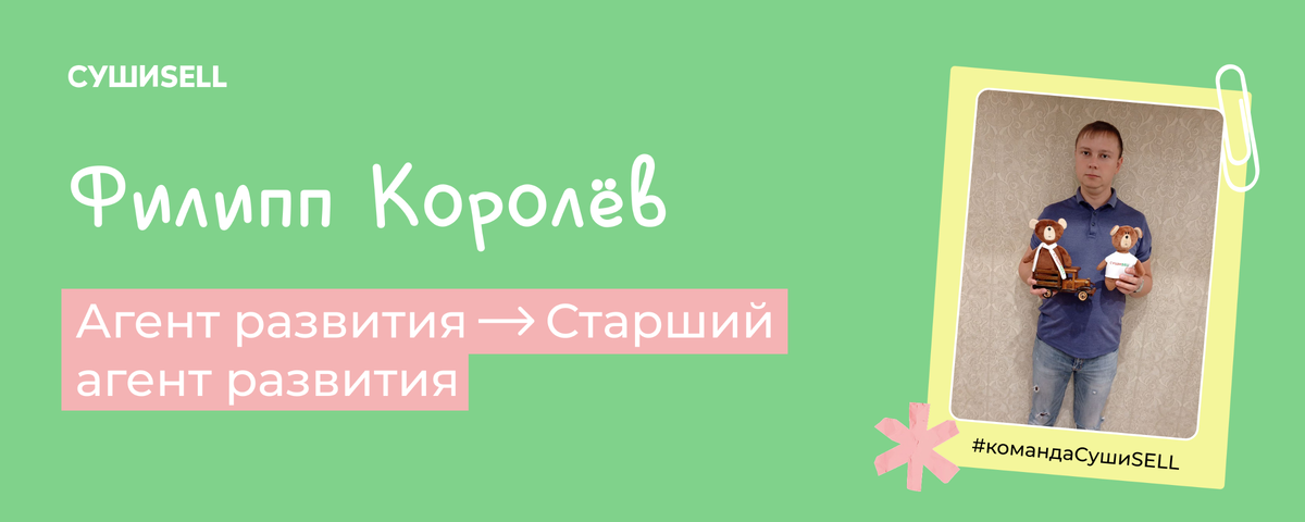 История роста: от новичка без опыта в общепите до старшего агента развития Филипп Королёв пришёл в «СушиSell» два года назад, имея за плечами 14 лет опыта в сфере коммуникаций с клиентами — но ни дня в общепите. В его регионе не было филиалов компании, и даже как клиент он не знал, что такое фирменные роллы компании. Первый день — просто наблюдение