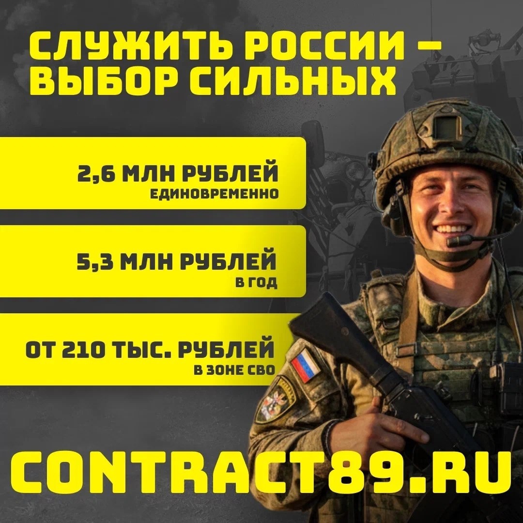 Обеспечить стабильный высокий доход тебе и твоей семье может контракт с ВС РФ. Военнослужащим полагается: • 2,6 млн рублей единовременно • 5,3 млн рублей в год • от 210 тыс. рублей в зоне СВО • социальные льготы и гарантии для всей семьи Узнать все подробности можно на сайте: contract89.ru