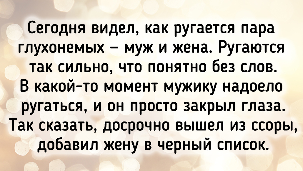 Сегодня видел, как ругается пара глухонемых — муж и жена. Ругаются так сильно, что понятно без слов. В какой-то момент мужику надоело ругаться, и он просто закрыл глаза. Так сказать, досрочно вышел из ссоры, добавил жену в черный список. © TihvinO / Pikabu