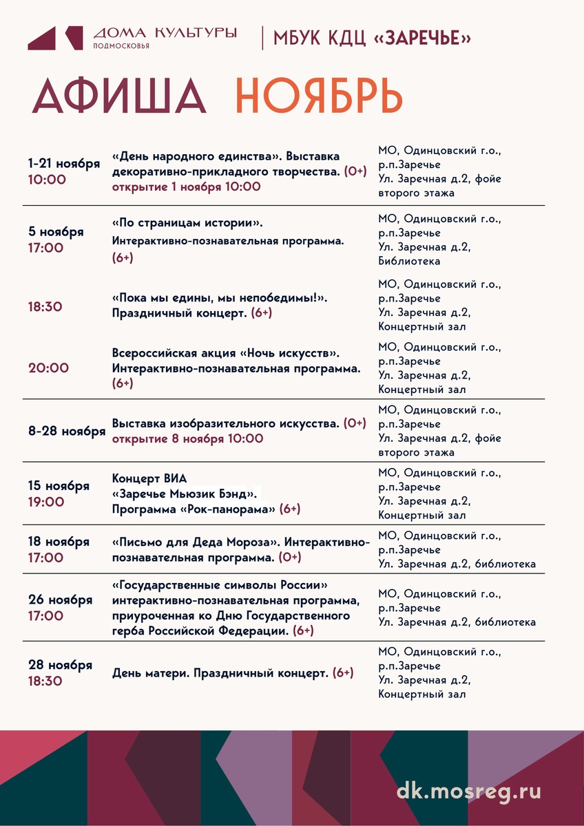 🍂 МЕРОПРИЯТИЯ КДЦ "ЗАРЕЧЬЕ" В НОЯБРЕ 🍂 В ноябре посетителей нашего центра ждут концерты, выставки изобразительного и декоративно-прикладного искусства, познавательные и развлекательные программы для всех возрастов. 🎶🎨📚 Ждем вас! #кдцзаречье #культура_одинцовскийгородскойокруг #культуравзаречье #культура #ОГО #культураОГО #мероприятия