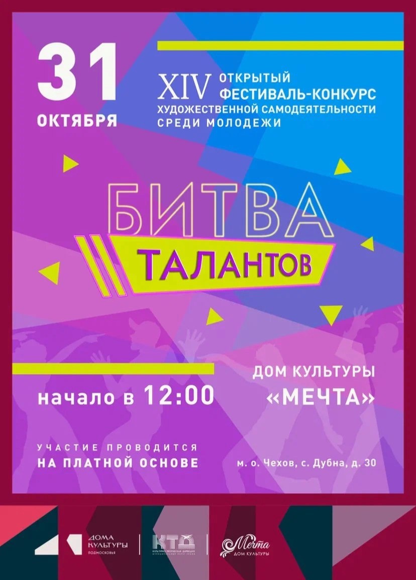 ✨ Конкурс «Битва талантов» в с. Дубна В этом году выступят 👫 Возрастные группы: - от 14 до 18 лет - от 19 до 35 лет 🎭 Номинации: - Солисты - Дуэты - Коллективы 📁Жанры: 🎤 Музыкальный: хип-хоп, рэп, поп, рок, RnB, эстрадный и народный вокал 💃 Танец ✍️ Литературное творчество: стихотворение, эссе, юмористическая сценка 🎸 Инструментальное исполнение 🎨 Оригинальный жанр Приём заявок окончен. Ждём выступлений 🚫 Возраст: 0+ 📆 31.10.2025 🕛 12:00 🏢 ДК «Мечта» 📍 г.о. Чехов, с. Дубна, д.30 🪙 Вход свободный❗️ ⭐Поддержать канал голосом ✅ Мероприятия Чехов https://dzen.ru/id/66cc4b48e9ef144699238a51 http://vk.com/chekhov_events http://dzen.ru/chekhov_events
