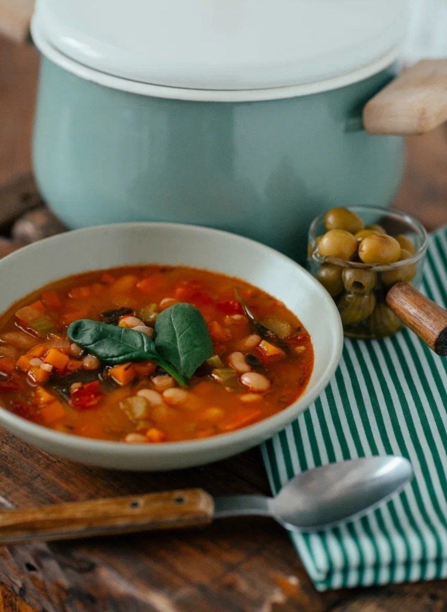 Фасоль (1 банка консервированной или 300–400 г отварной) Морковь — 2 шт. Болгарский перец — 1 шт. Лук-порей — 1 шт. Репчатый лук — 1 шт. Помидор — 1 шт. Протертые томаты — 500 г Оливковое масло — для обжарки Сок половинки лимона Лавровый лист Соль и специи по вкусу Вода — около 2,5 л Оливки и свежий хлеб — для подачи