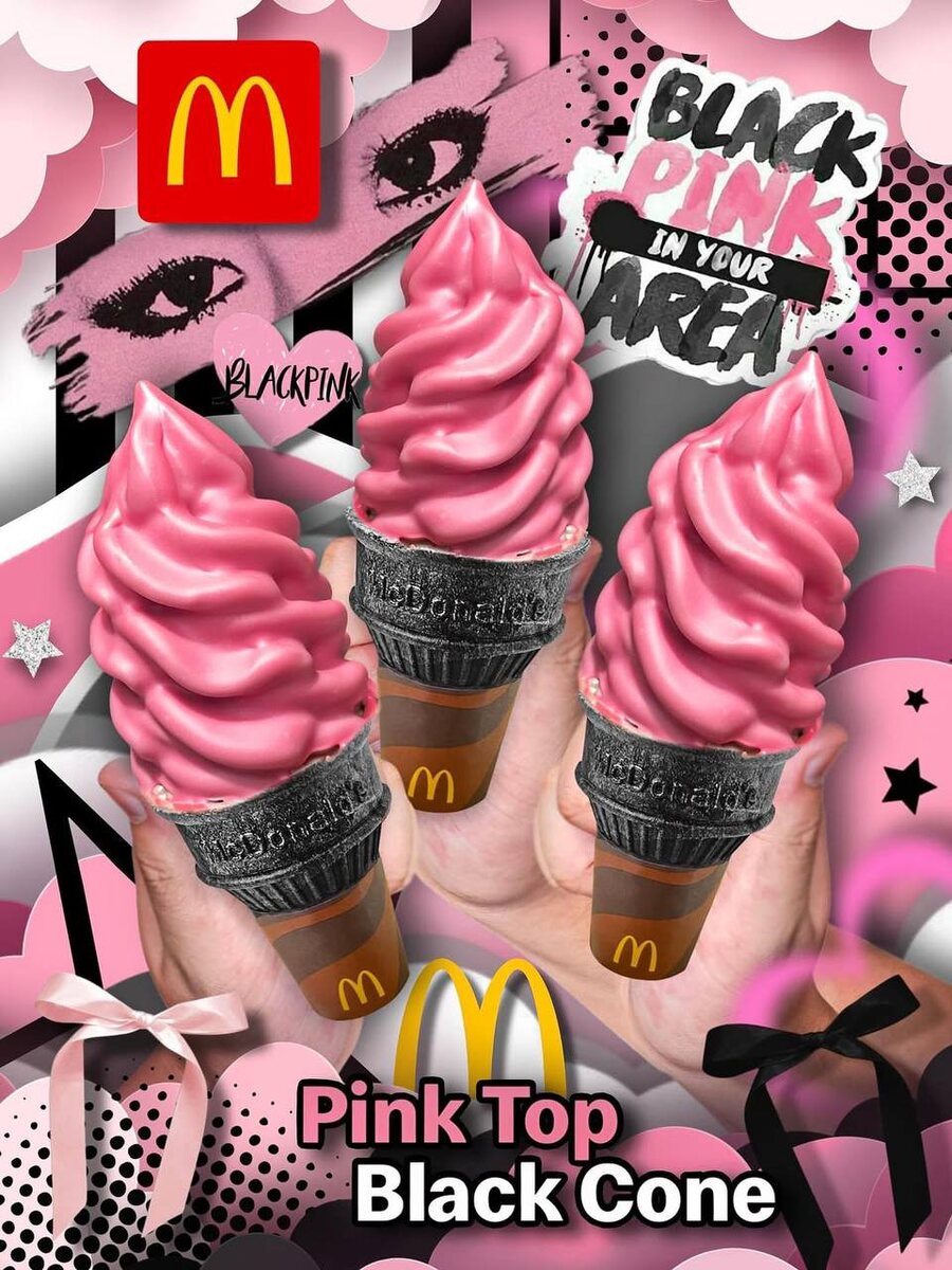 Индонезийский McDonald’s заколлабился с кейпопершами из Black pink и выпустил черно-розовую мороженку. Сверху розовое мягкое сливочно-шоколадное или сливочно-ванильное (на выбор) мороженое с клубничными слоями, а внизу хрустящий черный вафельный стаканчик. Кто-то начинает копить деньги на срочное путешествие 😃