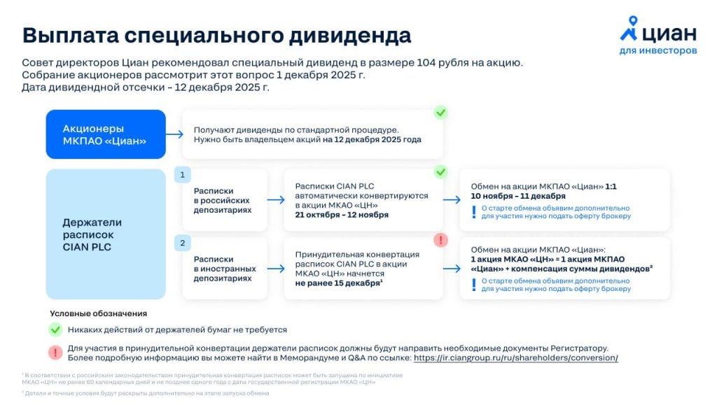Циан: специальный дивиденд и новые раунды обмена расписок Сегодня Циан объявила о рекомендации выплатить специальный дивиденд в размере 104 рубля на акцию, подтвердив репутацию одного из самых предсказуемых эмитентов на рынке. Совет директоров компании утвердил это решение в соответствии с ранее заявленным гайденсом, а итоговое утверждение собранием акционеров состоится 1 декабря 2025 года. 👉Дивидендная отсечка назначена на 12 декабря 2025 года — именно на эту дату придется основной спрос со стороны инвесторов, ориентированных на дивидендные истории. Спецдивиденд – логичный шаг после корпоративной реструктуризации и переезда компании в российскую юрисдикцию 👉После завершения редомициляции и консолидации активов в МКПАО «Циан» компания получила возможность распределить значительную часть прибыли прошлых лет, которая не могла быть выплачена ранее из-за технических ограничений переходного периода. При этом менеджмент обозначил и дальнейший ориентир – в 2026 году Циан планирует выпл