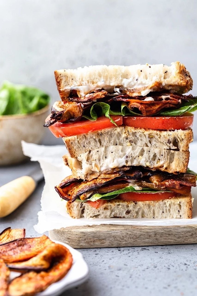 постный майонез (или веганский соус на растительной основе) Сборка бутербродов. Намажьте хлеб постным майонезом, выложите листья салата, затем кружочки помидора и тёплые баклажаны. По желанию можно добавить немного свежег