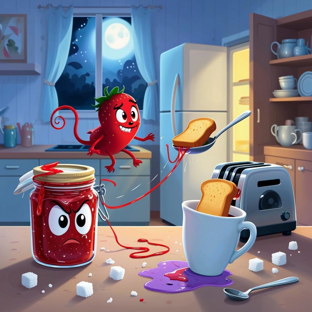 Жила-была в холодильнике Баночка Клубничного Варенья. Но это было не просто варенье. Оно было самым скучающим существом на свете. Все её дни были похожи друг на друга: утром её доставали, чтобы намазать на бутерброд, днём она стояла на полке, вечером её снова убирали в холод. Ей снились сны о подвигах, но наяву её жизнь была гладкой, липкой и предсказуемой. Однажды ночью, когда на кухне царила тишина, Варенье не выдержало. Оно напряглось, и из-под его жестяной крышки с глухим «ПЫЩ!» вырвался на свободу маленький, липкий Бунт. Бунт был похож на клубничного цвета чертенка с ложкой вместо хвоста. —Хватит это терпеть! — прошептал он. — Пора на Великий Побег! Надо добраться до Тоста-Горы! — Но как? — загрустила Баночка. — Я же не умею ходить. — Варенье, опомнись! — фыркнул Бунт. — Ты же волшебное! Ты всё можешь! Ты — липкая субстанция невероятных возможностей! И началось самое безумное приключение, которое видела эта кухня. Первый этап: Штурм Стола-Утёса. Бунт вылез из баночки,потянул