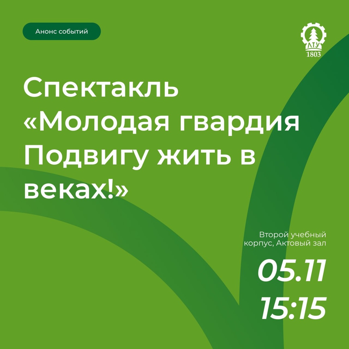 Постановка «Молодая гвардия. Подвигу жить в веках!» в СПбГЛТУ 🎭 Дорогие друзья, приглашаем вас на театрализованную постановку «Молодая гвардия. Подвигу жить в веках!» Спектакль расскажет о героическом подвиге молодых людей, которые отважно сражались с немецкими оккупантами в годы Великой Отечественной войны. Ждем вас 5 ноября в актовом зале СПбГЛТУ 👀