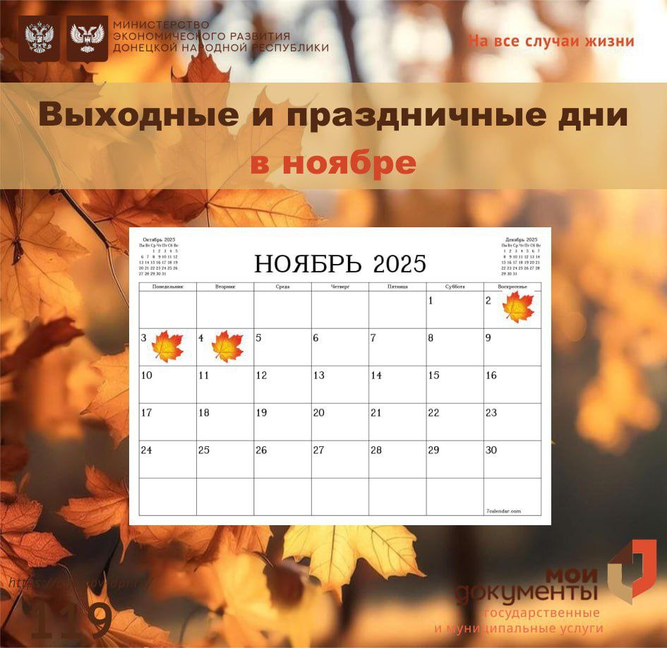 Уважаемые заявители! 💡В связи с празднованием Дня народного единства уведомляет об изменениях в графике работы отделений. ⏱1 ноября - для всех отделений рабочий день сокращен на 1 час 💡2, 3, 4 ноября — выходные праздничные дни для всех отделений 🕓С 05 ноября все отделения МФЦ работают согласно графикам работы отделений. 👌Ознакомиться с перечнем предоставляемых услуг вы можете на нашем официальном Портале МФЦ или по телефону Контакт-центра - 119. С уважением, МФЦ ❣️ Источник:https://t.me/mfc_dnr