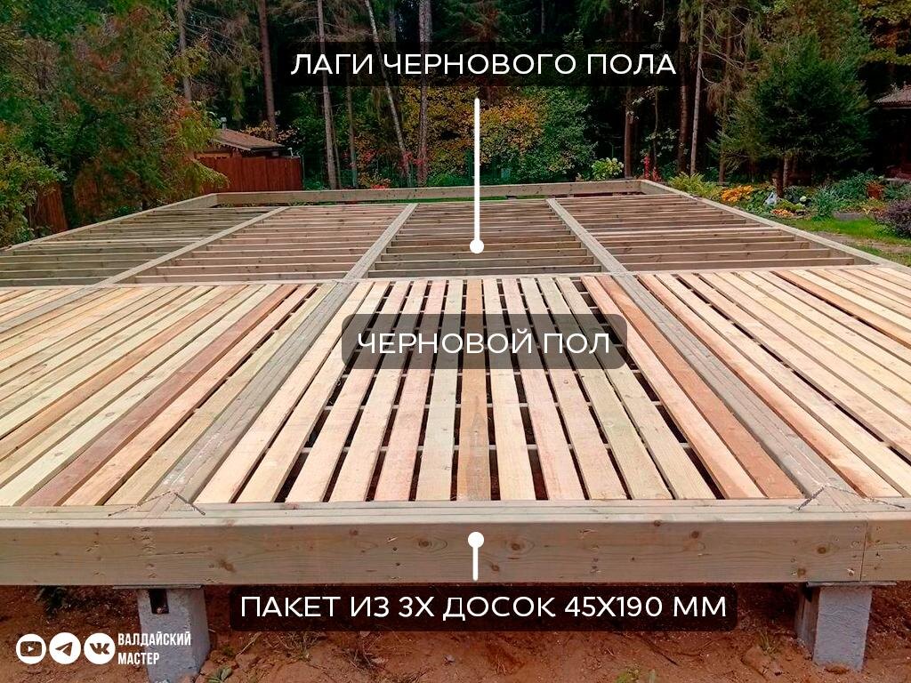 Продолжаем конструктивно-продуктивную тему о том как и из чего мы строим дома. В посте выше показал наш конструктив, а сегодня вернемся в начало строительного процесса. Поговорим про базовое основание наших домов: ➕ В основании применяется пакет из 3 досок 45х190мм ➕ Черновой пол монтируется в обвязку фундамента и включает себя основания из бруска + лаги 45х95 с шагом до 400мм + сам черновой пол из доски 20х100/150/200 с зазором ➕ В итоге мы получаем ровную и безопасную для плотника и его репродуктивных функциях платформу ➕ Черновой пол закрывается ветровлагозащитной мембраной, в отдельных случаях под мембрану устанавливается оцинкованная сетка от грызунов ➕ Далее монтируется платформа из доски 45х195, утепляемая в последствии на 300 мм, как спросите вы? Но об этом мы поговорим позже в отдельной теме про новый узел пола=) Замечу - весь конструктив собирается из доски камерной сушки, остроганной и пропитанной методом погружения в сенеж на нашем производстве. Мы строгаем все кроме дос