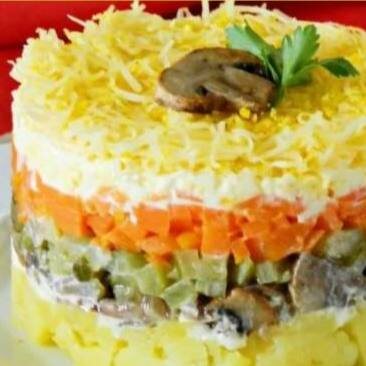 Салат "Семеновна" — это действительно простой, очень вкусный и сытный салат, который давно стал классикой на домашних застольях. Его главные плюсы — это доступные ингредиенты и потрясающее сочетание текстур и вкусов. Этот вариант можно назвать основным. Он идеально сбалансирован. · Куриное филе (или окорочка) — 1-2 шт. (около 300-400 г) · Шампиньоны свежие — 300 гр · Лук репчатый — 1 крупная головка · Яйца — 4-5 шт. · Сыр твердый (русский, голландский) — 200 г · Огурцы маринованные или соленые — 3-4 шт. (около 200 г) · Майонез — по вкусу (для прослойки) · Масло растительное — для жарки · Соль, перец черный молотый — по вкусу 1. Подготовка ингредиентов: · Курицу: Отварить в подсоленной воде до готовности (около 20-25 минут после закипания). Остудить и нарезать мелким кубиком. Можно обжарить филе до золотистой корочки, так будет даже вкуснее. · Грибы с луком: Лук нарезать мелким кубиком. Грибы промыть и также нарезать пластинками или кубиком. На сковороде разогреть масло, обжарить