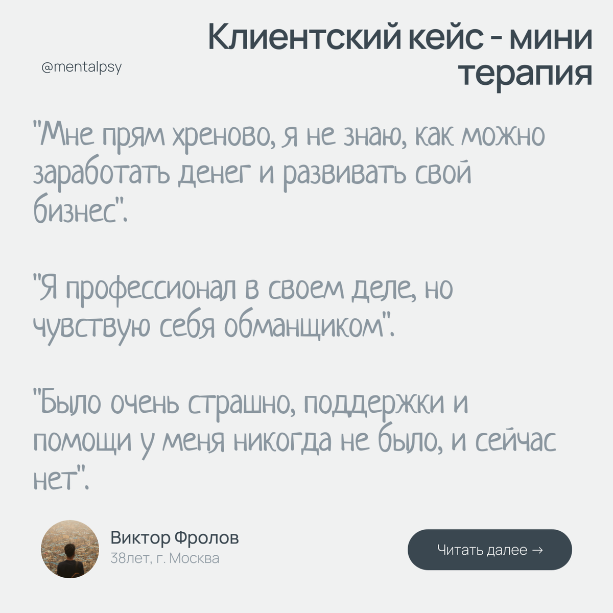 "Мне прям хреново, я не знаю, как можно заработать денег и развивать свой бизнес. Пока все идеи крутятся вокруг записи рилсов (но я не уверен, что к моему бизнесу это вообще применимо), но мне капец как стыдно что-то выкладывать в сети, кажется, что осудят, засмеют и отклика не будет. Хотя я профессионал в своем деле, но чувствую себя обманщиком (мне все детство об этом говорили, когда я говорил правду, и приучали стыдиться себя, что окружающие только и делают что меня осуждают и критикуют). И больше идей у меня нет, я будто в ступоре, как в детстве, когда мне в 7 лет говорили: нужны деньги- заработай, не можешь, не проси. Этот ступор и сейчас, я будто не знаю, что делать. Хотя я специалист в своем деле, результаты и окружающие это подтверждают, также я постоянно профессионально учусь, но я все равно не верю в себя.