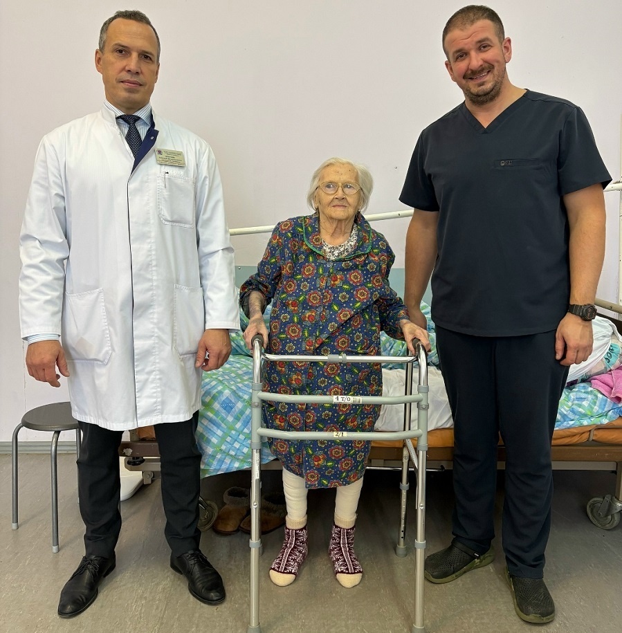 Женщину в наш город из другого региона страны доставили родственники. 92-летняя старушка 18 октября упала с кровати и сломала бедренную кость. К сожалению, с возрастом кости теряют свою прочность, и даже небольшое падение может привести к серьезным переломам, особенно в области бедра. По месту жительства операцию ей сделать не смогли из-за сопутствующей патологии. Тогда родственники приняли решение привезти бабушку в Ярославль. Женщину госпитализировали в 4-е отделение травматологии и ортопедии больницы имени Соловьева. После дополнительного обследования ее прооперировали, зафиксировав перелом при помощи металлоконструкции. «Благодаря высококвалифицированной работе врачей-травматологов-ортопедов и анестезиологов, пациентка, несмотря на свой возраст, уже на второй день после операции была поставлена на ноги. Вместе с заведующим отделением и лечащим врачом она сделала свои первые шаги после операции», – рассказали в ярославской больнице. А 27 октября пенсионерку выписали в хорошем настро