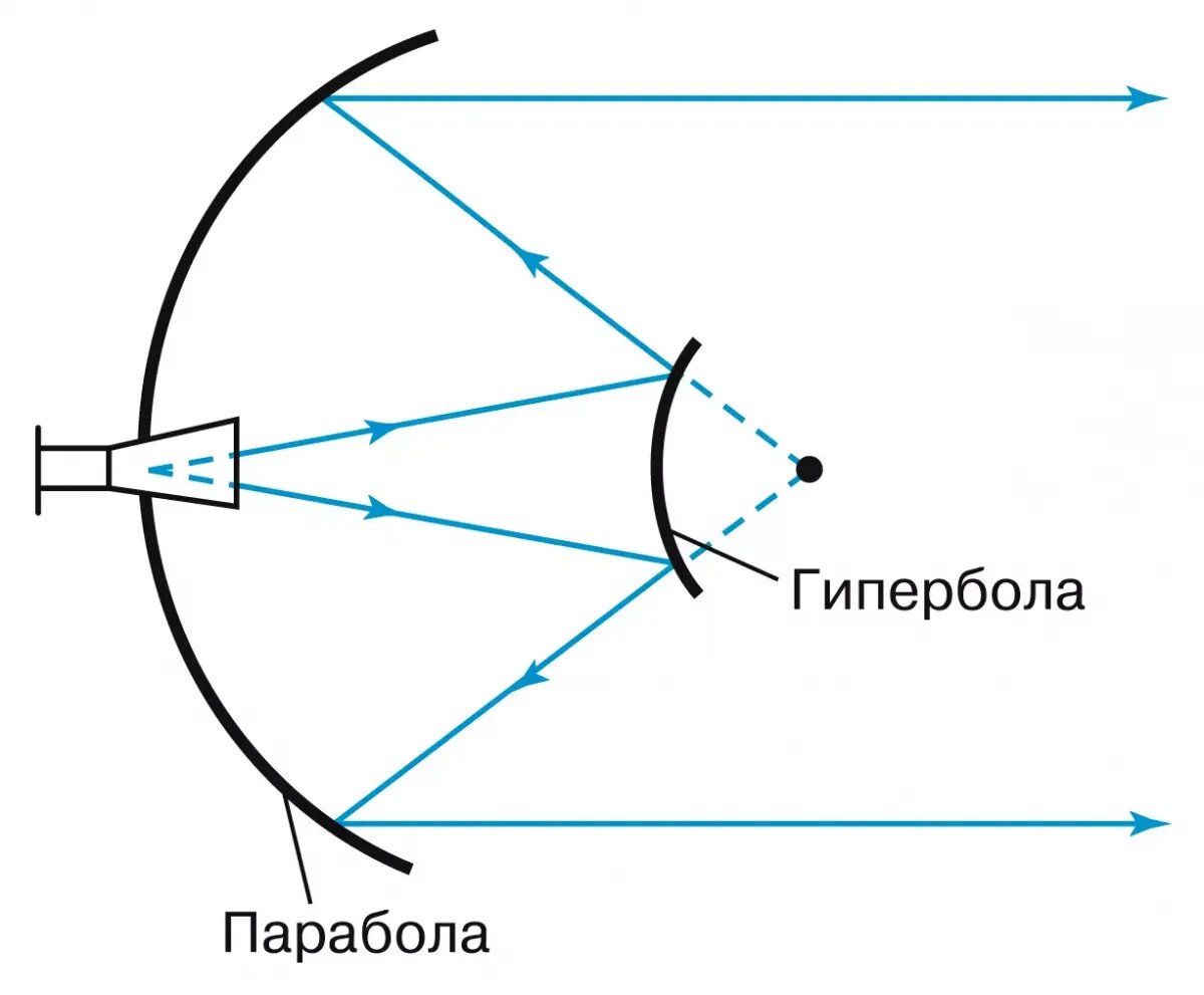 Или РЕФЛЕКТОР КАССЕГРЕНА. Эта простая и гениальная схема представляет собой комбинацию главного вогнутого зеркала-параболоида и вторичного вогнутого зеркала-гиперболоида. Прелесть конструкции в том, что оптический путь в ней замыкается сам на себя относительно входной апертуры главного зеркала оптической системы. При этом фокус находится за главным зеркалом, а вторичное выпуклое зеркало добавляет эффект телефото, позволяя добиться гораздо большего фокусного расстояния, чем в классической схеме. Но есть и современные варианты, в которых для повышения производительности главное зеркало может быть гиперболическим, кроме того, оба они могут быть сферическими или эллиптическими для упрощения производства. В главном зеркале обычно есть отверстие в центре, через которое свет попадает в окуляр, камеру или датчик изображения. Впервые подобная схема была описана французским оптиком Лораном Кассегреном в 1672 году. При этом он честно признавался, что использовал опыт предшественников, которые п