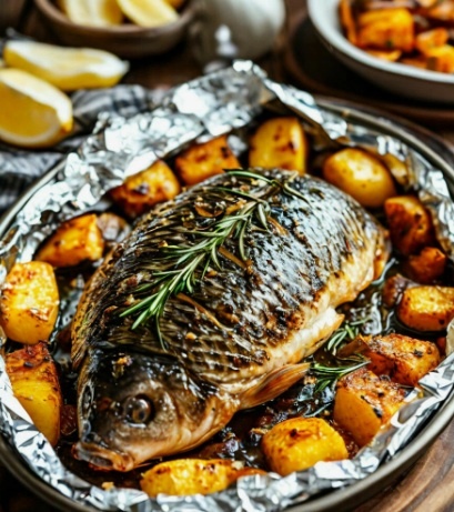 - Сазан в духовке с готовым картофелем, выньте из рыбы дольки лимона с укропом и подавайте на стол, украсив зеленью. Будет очень вкусно, если дополнительно полить нарезанные кусочки рыбы лимонным соком.