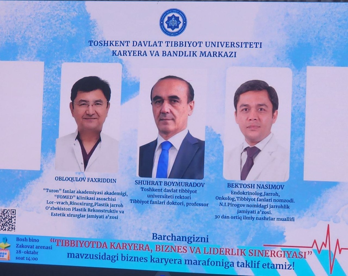 🔺#TIBBIYOTDA_KAR’YERA_BIZNES VA LIDERLIK SINERGIYASI: #Uch_dars_uch_taqdir 🔺Tibbiyotda kar’yera qurish — bu faqat lavozim emas. Bu inson sifatida ulg‘ayish, mehr bilan xizmat qilish, har kuni yangidan inson bo‘lish san’atidir. Bu uchrashuvda aytilgan har bir so‘z, keltirilgan har bir voqea — yoshlar uchun saboq edi. #Shuhrat_Boymuradov — sabr va insoniylik timsoli. #Faxriddin_Obloqulov — mehnat va halollik namunasi. #Bektosh_Nasimov — ilm va zamonaviy fikrlash ramzi. 👉https://telegra.ph/TIBBIYOTDA-KARYERA-BIZNES-VA-LIDERLIK-SINERGIYASI-Uch-dars-uch-taqdir-10-28 ✅Rasmiy sahifalarimiz: Telegram | Facebook | Instagram | YouTube | X | LinkedIn