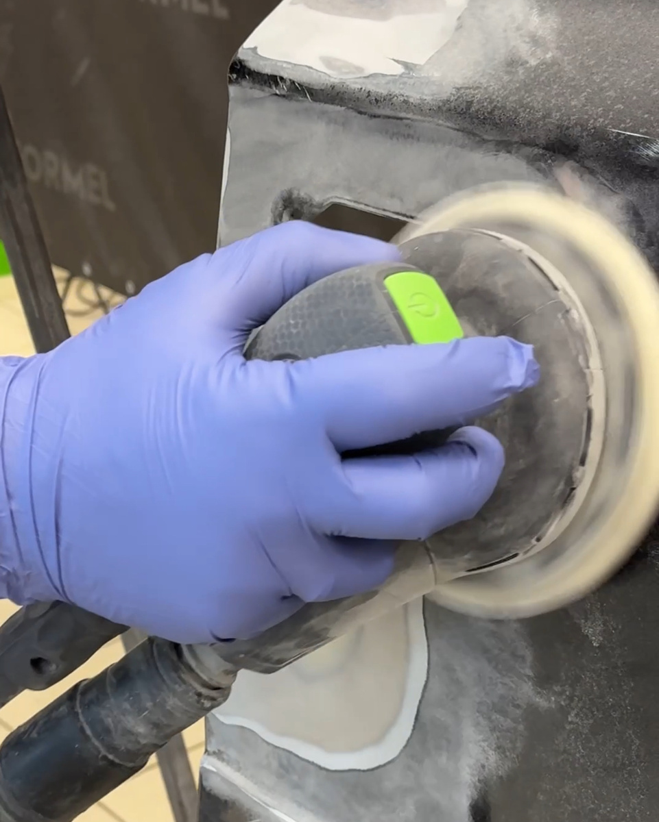 1) Подготовленный участок должен быть отшлифован абразивами P280 или P320, после чего необходимо тщательно очистить его от пыли и обезжирить. 2) Затем изолируем открытый металл с помощью первичного грунта. 3) После этого точно следуем инструкциям на ТДС и смешиваем 2К акриловый грунт. 4) Для нанесения используем краскопульт с дюзой 1.7, выставляя давление на манометре в 2 кг/см². 5) Грунт наносится в 2-3 слоя. 6) После высыхания шлифуем вручную абразивом P400, а затем машинной шлифовкой с абразивом P500. 7) Сложнодоступные участки обрабатываем серым шлифовальным войлоком. Используете другую технологию? Поделитесь ею в комментариях 👇