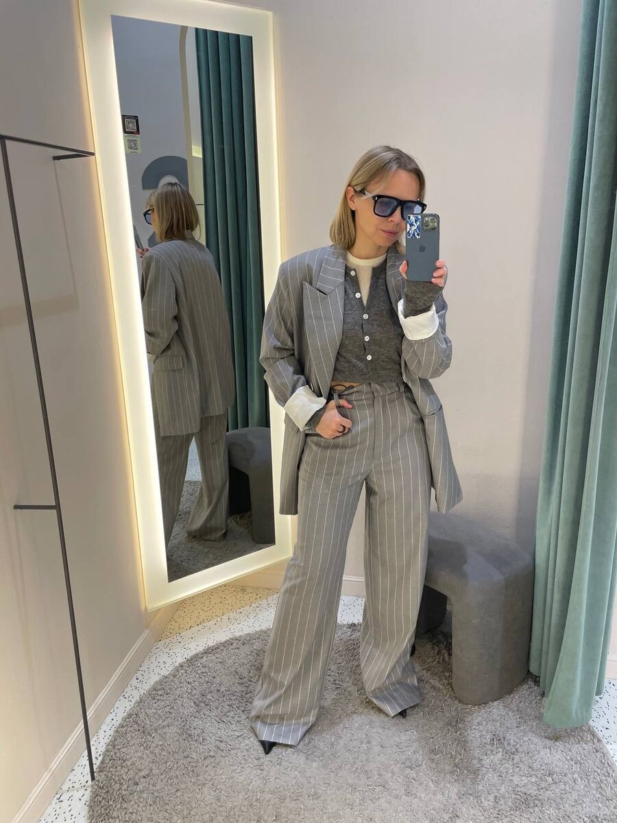 Цена жакета около 15 и брюк около 8, но если есть программа лояльности, то цена будет меньше. Бренд рассчитан на рост 170 см. У меня где-то 10 см шпилька и еще если присмотреться, то видно, что брюки лежат на полу. На что смотрим: 1. Понравился костюм в полоску. Я давно о таком себе мечтаю, но все время что-то не складывается. В этот раз брюки с идеальной посадкой, но жакет one size и я немного утонула, но с другой стороны мой черный такого же размера 2. Трендовый коричневый. Понравился фасон жилета. Сделан очень хитро. Внутри пришиты подплечники, чтобы сделать увеличенную и жесткую линию плеча, но при этом как только тренд уйдет его можно убрать. 3. Леопардовый жакет. Он же есть в белом, молочном, черном, с открытой спиной. В общем разные варианты. Для меня он как платье. Но вам все таки нужна будет под него юбка. Понравилась та, что на мне: из-за фактуры и потому что это шорты. Собственно это был третий пост про костюмы деловые для офиса