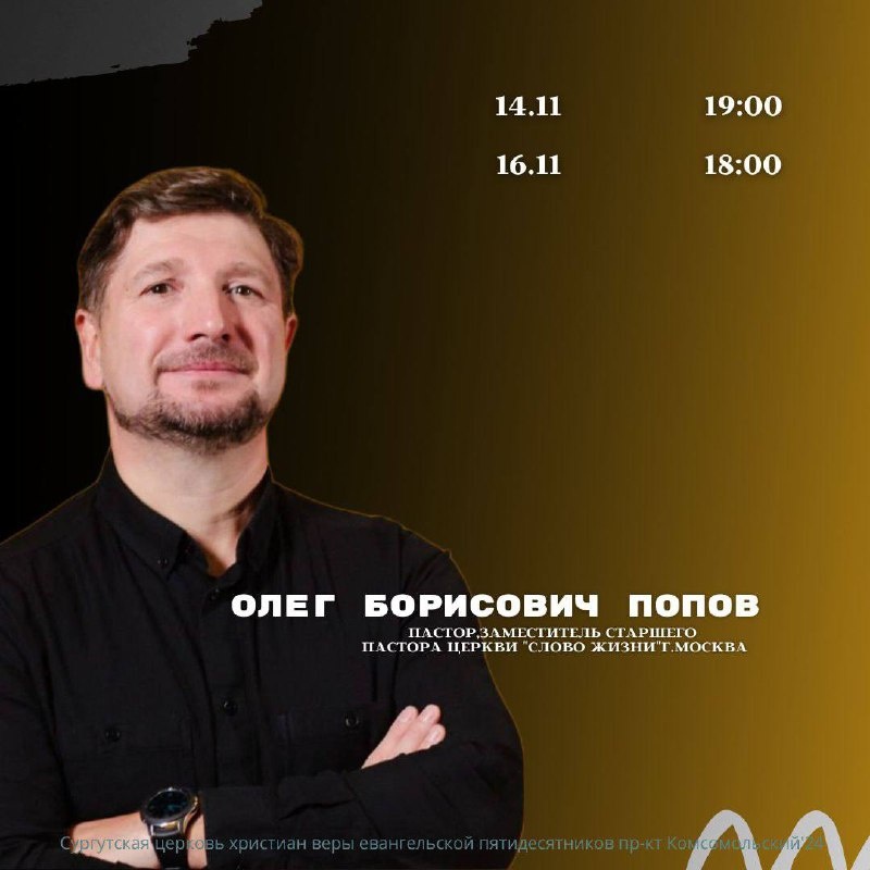 Дорогая церковь! 📅14.11.2025 - 19:00 📅16.11.2025 - 18:00 В нашей церкви пройдут служения с Олегом Борисовичем Поповым. Это будет благословенное время для всех нас! Заранее высвободите время для посещения собрания. А также приглашайте родных и знакомых.