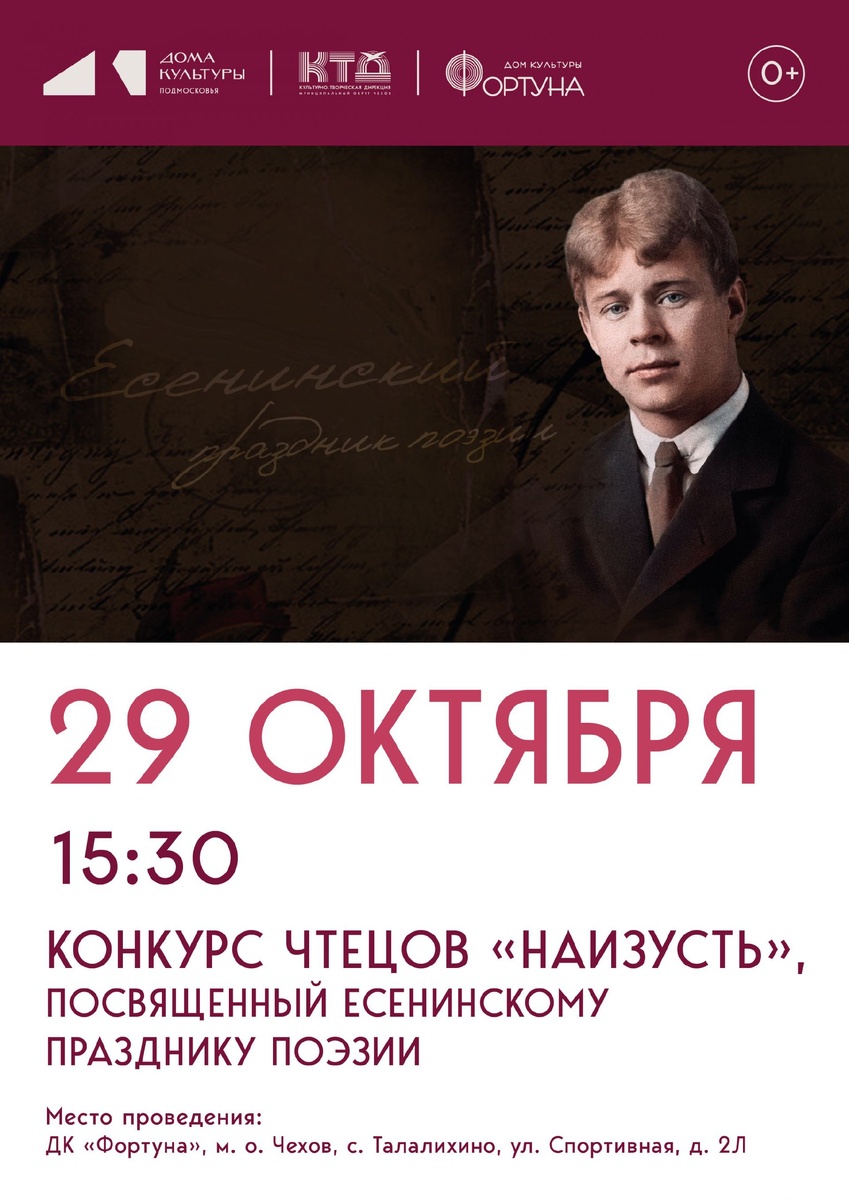 ✨ Конкурс чтецов «Наизусть», посвященном Есенинскому празднику поэзии 📖Сергей Есенин, осенний поэт России, оставил неизгладимый след в литературе и сердцах людей. 📚 Приглашаем всех желающих стать участниками конкурса чтецов, чтобы вместе почтить его творчество и вдохновение! 🚫 Возраст: 6+ 📆 29.10.2025 🕛 15:30 🏢 ДК «Фортуна» 📍 г.о. Чехов, с. Талалихино, ул. Спортивная, д.20 🪙 Вход свободный❗️ ⭐Поддержать канал голосом ✅ Мероприятия Чехов https://dzen.ru/id/66cc4b48e9ef144699238a51 http://vk.com/chekhov_events http://dzen.ru/chekhov_events