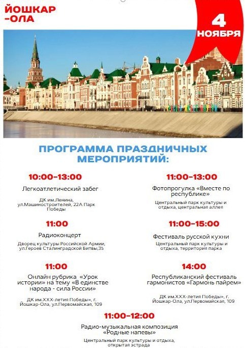 🇷🇺 В Йошкар-Оле с 29 октября по 11 ноября пройдут праздничные мероприятия, посвященные Дню народного единства и 105-летию Республики Марий Эл Программа включает в себя выставки, творческие конкурсы, лекции и концерты, рассчитанные на широкую аудиторию. С подробной афишей можно ознакомиться на официальном сайте.