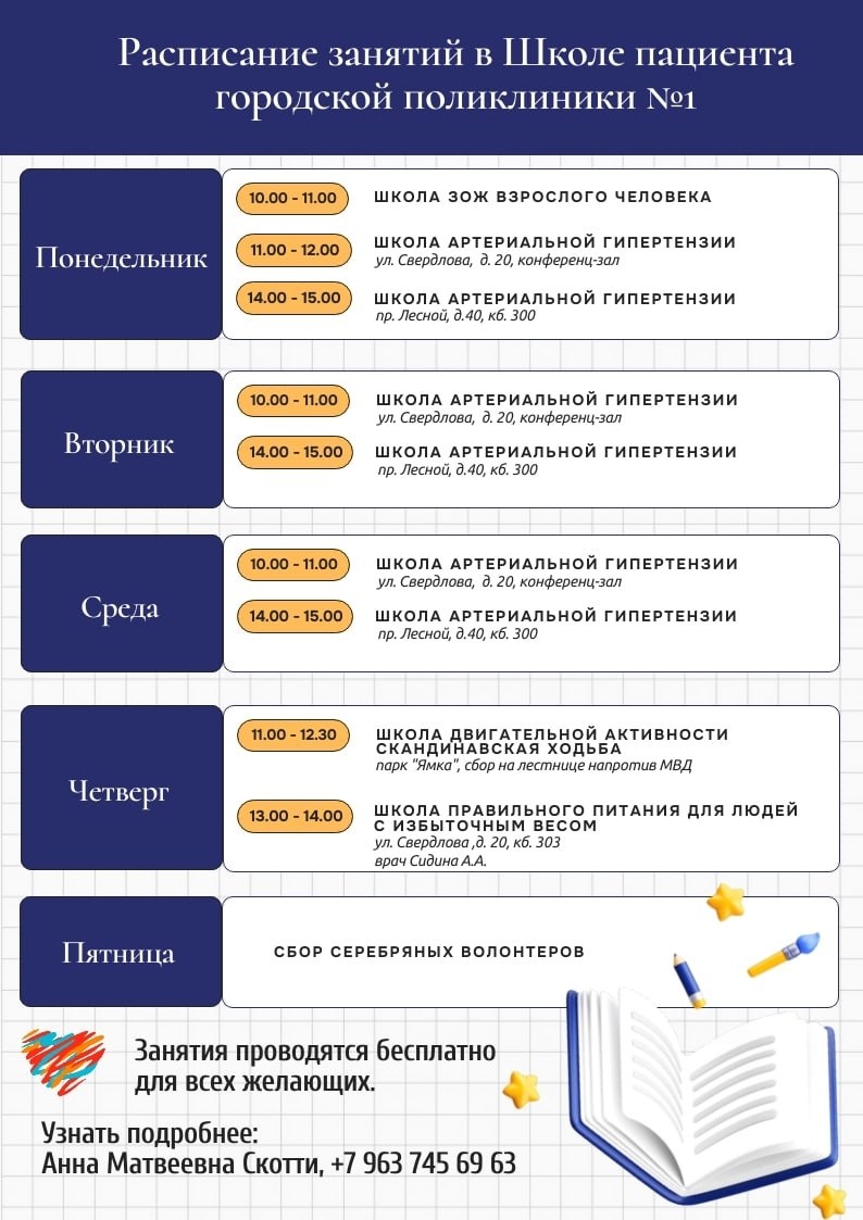 π₯ Π ΡΠΊΠΎΠ»Π΅ ΠΏΠ°ΡΠΈΠ΅Π½ΡΠ° ΠΠΎΡΠΎΠ΄ΡΠΊΠΎΠΉ ΠΏΠΎΠ»ΠΈΠΊΠ»ΠΈΠ½ΠΈΠΊΠΈ β1 Π΄ΠΎΡΡΡΠΏΠ½Ρ Π½Π°ΠΏΡΠ°Π²Π»Π΅Π½ΠΈΡ ΠΎΠ±ΡΡΠ΅Π½ΠΈΡ: - ΠΡΡΠ΅ΡΠΈΠ°Π»ΡΠ½Π°Ρ Π³ΠΈΠΏΠ΅ΡΡΠ΅Π½Π·ΠΈΡ. Π£Π·Π½Π°Π΅ΡΠ΅, ΠΊΠ°ΠΊ ΠΊΠΎΠ½ΡΡΠΎΠ»ΠΈΡΠΎΠ²Π°ΡΡ Π°ΡΡΠ΅ΡΠΈΠ°Π»ΡΠ½ΠΎΠ΅ Π΄Π°Π²Π»Π΅Π½ΠΈΠ΅, ΠΏΡΠ°Π²ΠΈΠ»ΡΠ½ΠΎ ΠΏΡΠΈΠ½ΠΈΠΌΠ°ΡΡ ΠΏΡΠ΅ΠΏΠ°ΡΠ°ΡΡ ΠΈ ΠΏΡΠ΅Π΄ΠΎΡΠ²ΡΠ°ΡΠ°ΡΡ ΠΎΡΠ»ΠΎΠΆΠ½Π΅Π½ΠΈΡ. - ΠΠ·Π±ΡΡΠΎΡΠ½ΡΠΉ Π²Π΅Ρ. ΠΠΎΠ»ΡΡΠΈΡΠ΅ ΡΠ΅ΠΊΠΎΠΌΠ΅Π½Π΄Π°ΡΠΈΠΈ ΠΏΠΎ Π·Π΄ΠΎΡΠΎΠ²ΠΎΠΌΡ ΠΏΠΈΡΠ°Π½ΠΈΡ, ΡΠ°Π·ΡΠ°Π±ΠΎΡΠΊΠ΅ ΠΈΠ½Π΄ΠΈΠ²ΠΈΠ΄ΡΠ°Π»ΡΠ½ΠΎΠ³ΠΎ ΡΠ°ΡΠΈΠΎΠ½Π° ΠΈ Π±Π΅Π·ΠΎΠΏΠ°ΡΠ½ΠΎΠΌΡ ΡΠ½ΠΈΠΆΠ΅Π½ΠΈΡ Π²Π΅ΡΠ°. - Π€ΠΈΠ·ΠΈΡΠ΅ΡΠΊΠ°Ρ Π°ΠΊΡΠΈΠ²Π½ΠΎΡΡΡ. ΠΠ°ΡΡΠΈΡΠ΅ΡΡ ΠΏΡΠ°Π²ΠΈΠ»ΡΠ½ΠΎ ΠΏΠΎΠ΄Π±ΠΈΡΠ°ΡΡ Π½Π°Π³ΡΡΠ·ΠΊΠΈ Ρ ΡΡΠ΅ΡΠΎΠΌ ΡΠΎΡΡΠΎΡΠ½ΠΈΡ Π·Π΄ΠΎΡΠΎΠ²ΡΡ ΠΈ Π²ΠΎΠ·ΡΠ°ΡΡΠ°. - ΠΠΎΠ»ΠΎΠ½ΡΠ΅ΡΡ ΡΡΠ°ΡΡΠ΅Π³ΠΎ ΠΏΠΎΠΊΠΎΠ»Π΅Π½ΠΈΡ. ΠΡΠΈΡΠΎΠ΅Π΄ΠΈΠ½ΠΈΡΠ΅ΡΡ ΠΊ Π°ΠΊΡΠΈΠ²Π½ΠΎΠΌΡ ΡΠΎΠΎΠ±ΡΠ΅ΡΡΠ²Ρ ΠΈ ΡΠ·Π½Π°Π΅ΡΠ΅ ΠΎ Π²ΠΎΠ·ΠΌΠΎΠΆΠ½ΠΎΡΡΡΡ