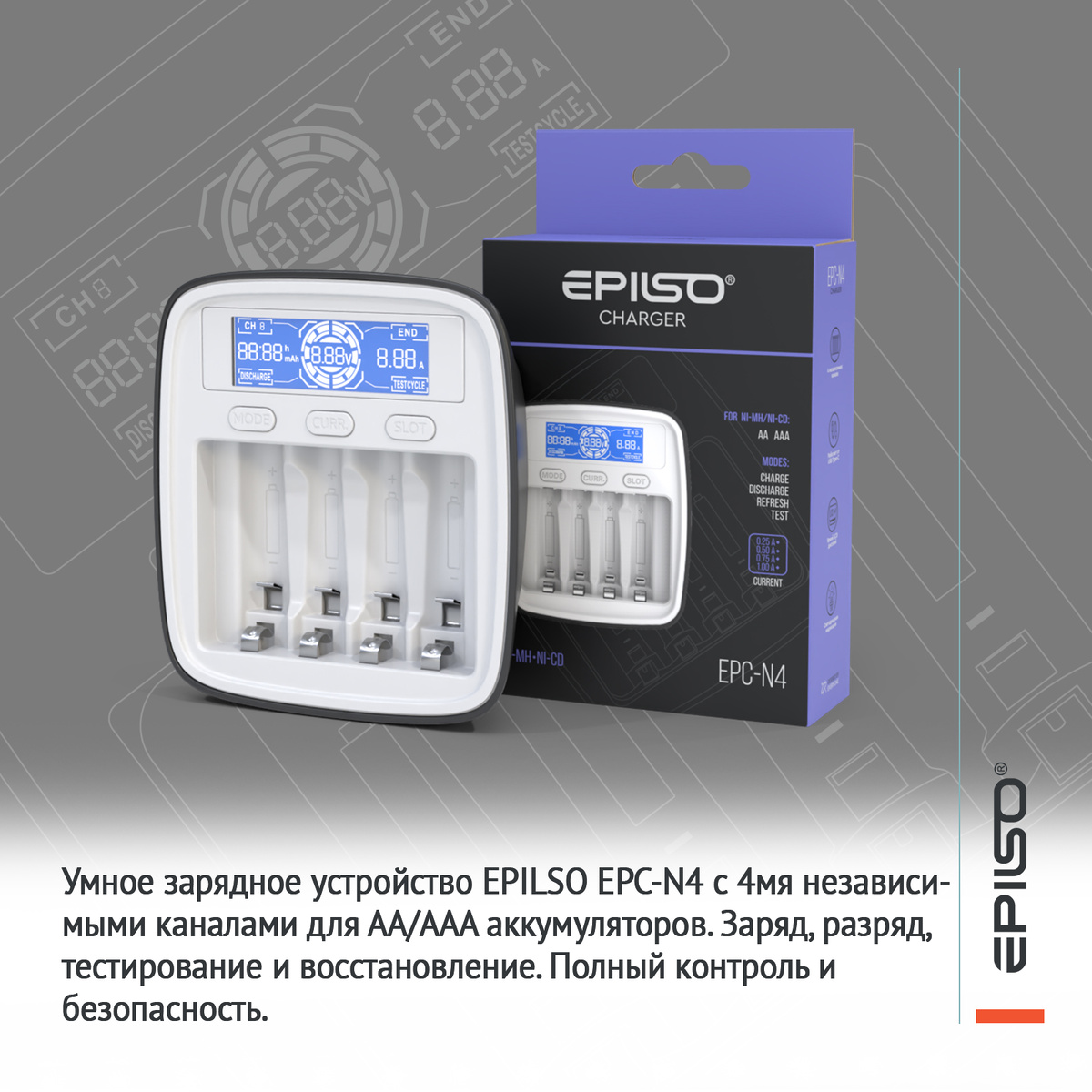 EPILSO EPC-N4 — это автоматическое зарядное устройство для аккумуляторов форматов AA и AAA типов Ni-MH (никель-металлгидрид) и Ni-Cd (никель-кадмиевые). Его ключевое преимущество — наличие четырёх независимых каналов, что позволяет заряжать, разряжать и тестировать каждый аккумулятор индивидуально, независимо от состояния соседних.