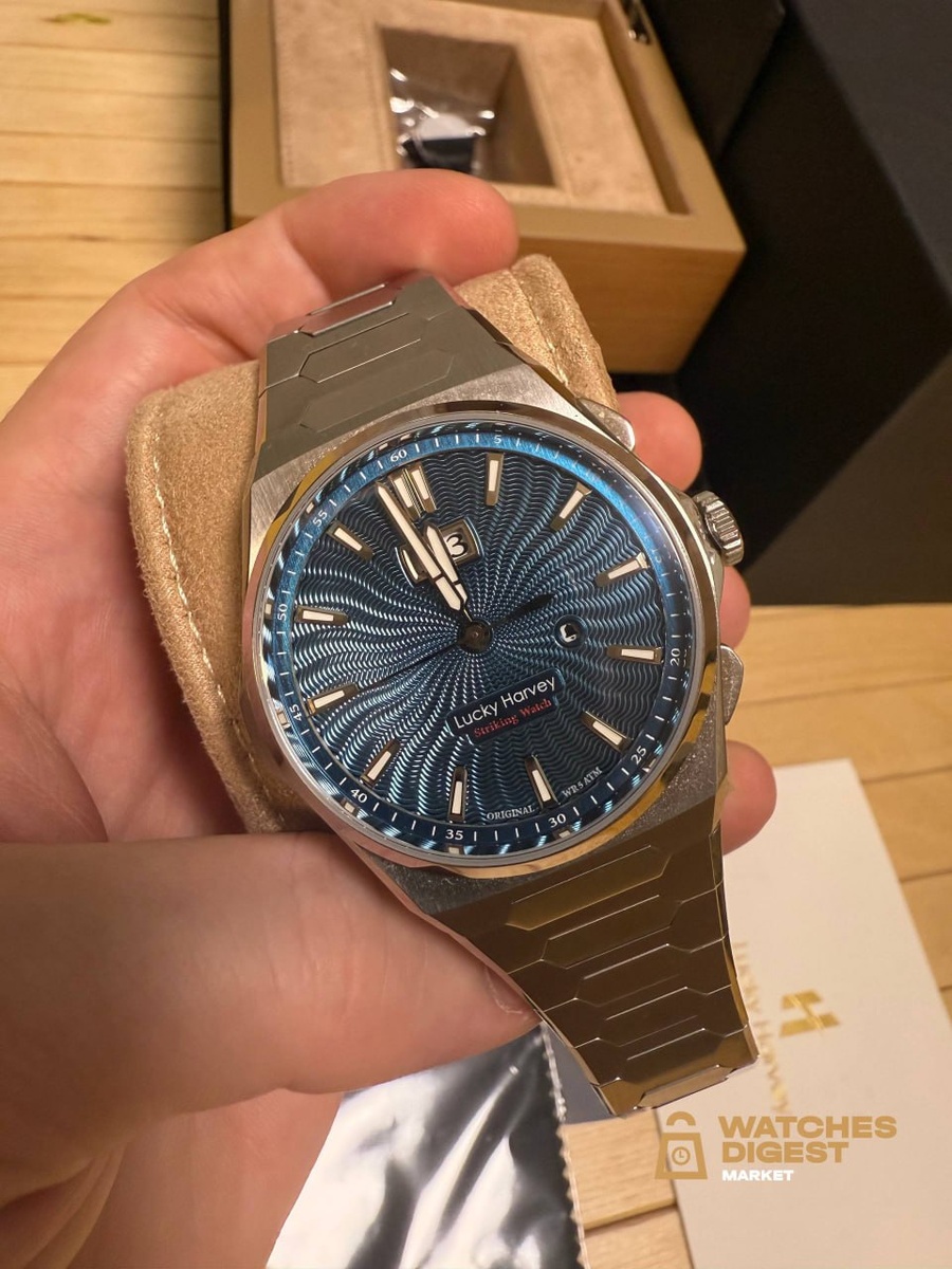 LUCKY HARVEY SOUNDS OF NATURE OCEAN BLUE: ТИХИЙ ЗВОН МЕХАНИКИ #обзор_WD Lucky Harvey — молодой независимый бренд, сумевший привлечь внимание ценителей механики сочетанием эстетики и эксперимента. Модель Sounds Of Nature Ocean Blue передаёт гармонию природы через звук и движение механизма. Дизайн и материалы Корпус диаметром 40 мм и толщиной 12 мм выполнен из нержавеющей стали, как и браслет. Пропорции сбалансированы: часы выглядят современно и универсально по размеру. Циферблат с глубоким гильошированным рисунком, окрашенный в насыщенный синий цвет, напоминает игру океанских волн. Метки выполнены в виде стальных штрихов с люминофором, а на позиции 12 часов расположено окошко даты, выстроенное в симметрии с логотипом бренда. Сапфировое стекло с антибликовым покрытием подчёркивает чистоту синего тона и глубину фактуры. На задней крышке выгравирована звуковая волна, символ фирменной концепции коллекции. Крышка закреплена четырьмя винтами, придающими часам технический характер. Механи