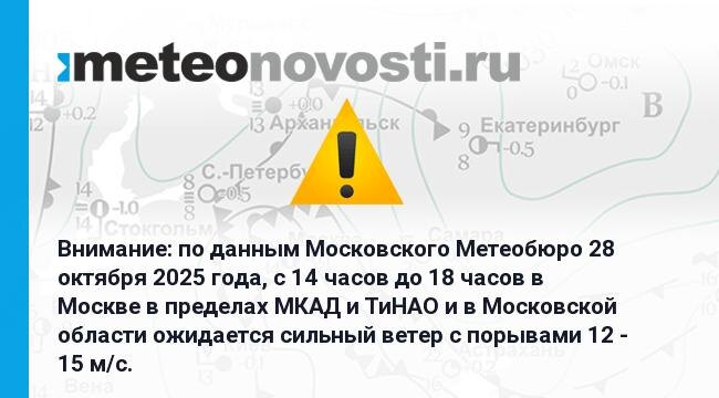 Внимание: по данным Московского Метеобюро 28 октября 2025 года, с 14 часов до 18 часов в Москве в пределах МКАД и ТиНАО и в Московской области ожидается сильный ветер с порывами 12 - 15 м/с. Перейти на сайт Прогноз погоды на 14 дней