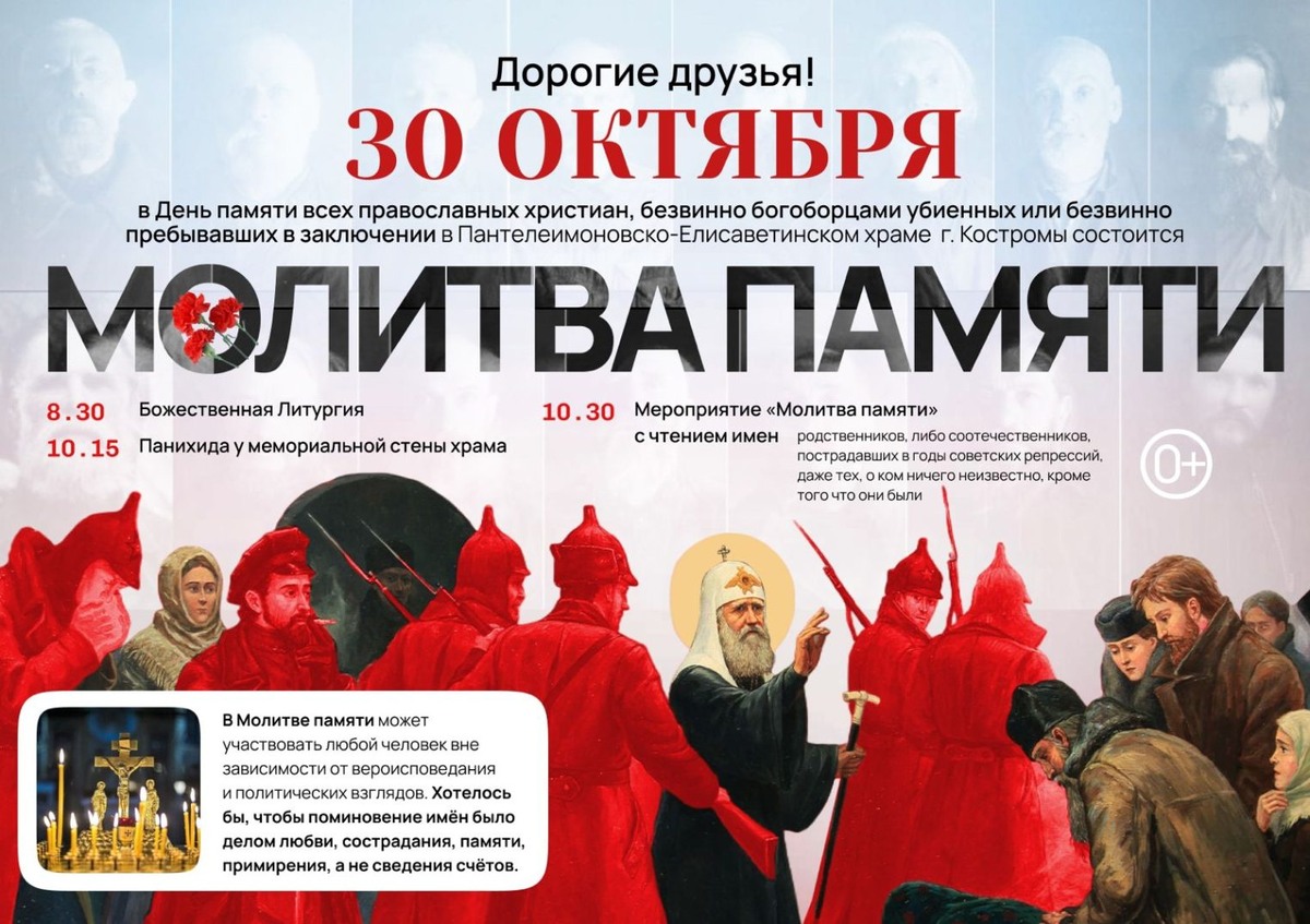 В воскресенье 30 октября в Костроме пройдет традиционная акция «Молитва памяти». В 10:30 костромичи прочитают имена репрессированных у мемориальной стены Пантелеимоновско-Елисаветинского храма по адресу: Депутатская, 50. Все желающие смогут подойти к микрофону и прочитать вслух имена земляков, пострадавших в годы репрессий. Участники получат листочки из Книги памяти: имя, возраст, род занятий и приговор. Кроме того, каждый желающий сможет прочитать имена своих репрессированных родственников. Расписание на 30 октября: