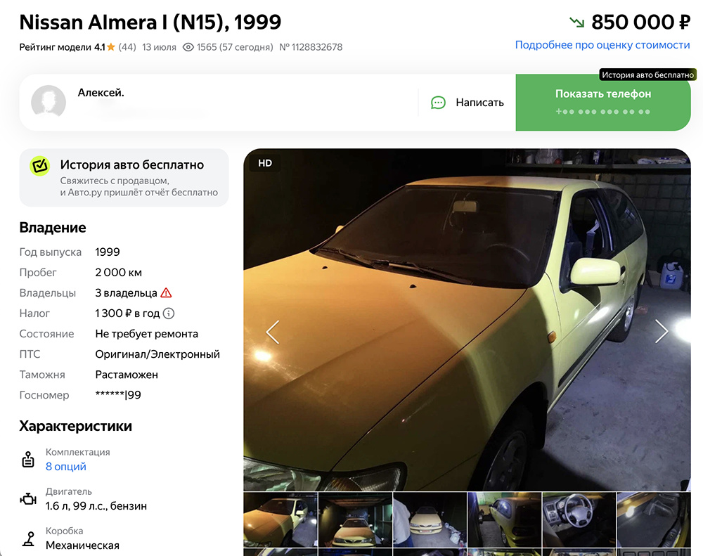 В Москве продают Nissan Almera 1999 года, простоявшую в гараже с момента покупки