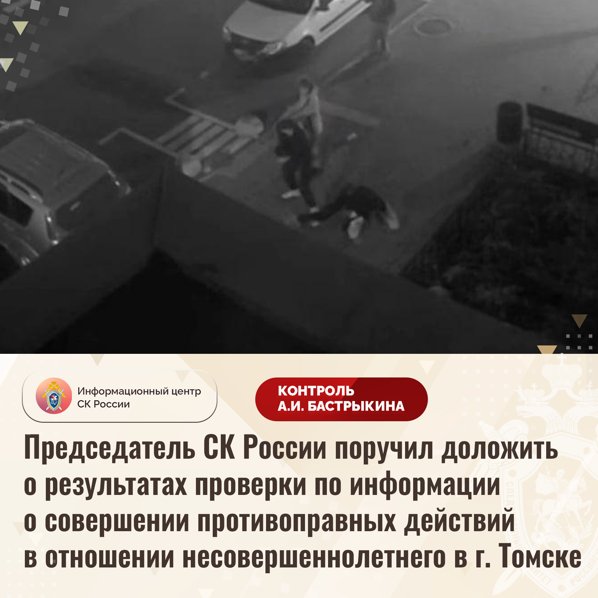 Председатель СК России поручил доложить о результатах проверки по информации о совершении противоправных действий в отношении несовершеннолетнего в г. Томске В СМИ сообщается, что в октябре текущего года на территории одного из жилых комплексов в городе Томске подросток жестоко избил 15-летнего мальчика. Пострадавшему потребовалась медицинская помощь. Отмечается, что фигурант ранее неоднократно совершал противоправные действия в отношении местных жителей. В СУ СК России по Томской области организована процессуальная проверка. Председатель Следственного комитета Российской Федерации Александр Иванович Бастрыкин поручил руководителю СУ СК России по Томской области Андрею Викторовичу Щукину доложить о ходе и результатах процессуальной проверки. Исполнение поручения, а также ход процессуальной проверки поставлены на контроль в центральном аппарате ведомства. #СледственныйКомитет #СКРоссии #СКР #ИЦСКР #Информационныйцентр #АлександрБастрыкин #ПредседательСКР #КонтрольПредседателяСКР #Комме