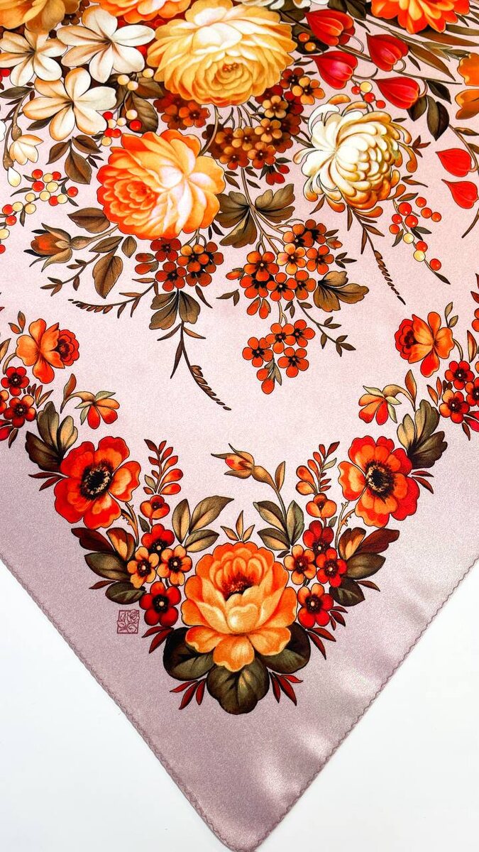 💗Обратите внимание, какими объемными выглядят соцветия на этом нежно-розовом фоне, как будто написаны прямо по ткани. А оранжево-терракотовая гамма задаёт настроение закатного света.
