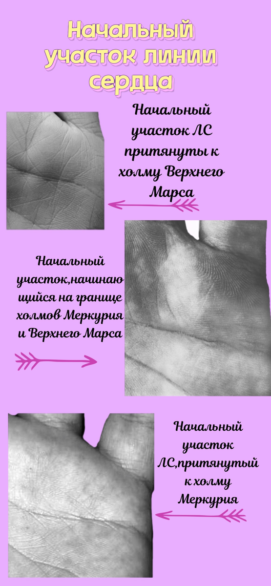 Начальный участок линии Сердца всегда находится под холмом Меркурия и показывает кроме наличия врожденных заболеваний сердечно-сосудистой системы человека и привязанностей в детстве, еще и основные черты характера и определяет поведение личности на протяжении всего жизненного пути человека. Таким образом,любое смещение начального участка линии Сердца или любая ветка, идущая на тот или иной холм, наделяет человека с самого раннего детства качествами той планеты, которая в дальнейшем будет определять многие черты характера человека. По данному участку можно узнать, какой будет человек: ✅ответственный или безответственный, как он будет относиться к своим детям и родным людям, способен ли он заботится о своих близких или самоустранится от этого, а также по начальному участку можно понять общую характеристику личности в любовных отношениях: способен ли он больше получать от любви или отдавать всего себя в развитие гармоничных отношений. 💫Идеальное начало линии Сердца должно идти с ребр