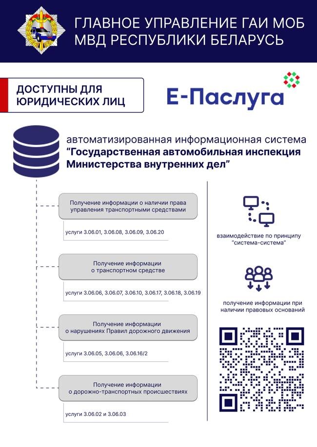 На едином портале электронных услуг «Е-Паслуга» можно воспользоваться различными электронными сервисами по линии Госавтоинспекции. Все услуги предоставляются на основании достоверных и актуальных сведений из автоматизированной информационной системы ГАИ (АИС ГАИ) безопасно и конфиденциально. В личном кабинете сервиса «Е-Паслуга» можно: • получить сведения о нарушениях по линии ГАИ в отношении себя (услуга 3.06.16/1); • выполнить проверку нахождения транспортного средства в розыске по VIN-номеру (услуга 3.59.01); • проверить нахождение регистрационного знака в розыске в Беларуси либо транспортного средства в розыске в Беларуси и странах СНГ (услуга 3.59.02); • получить систематизированные сведения об автомобиле (о транспортном средстве и его регистрации в ГАИ, ДТП, оформленных сотрудниками ГАИ, нахождении в розыске, договоре страхования, диагностических сведениях) (услуга 3.58.01). По принципу «система – система» госорганы и юридические лица при наличии правовых оснований могут получить