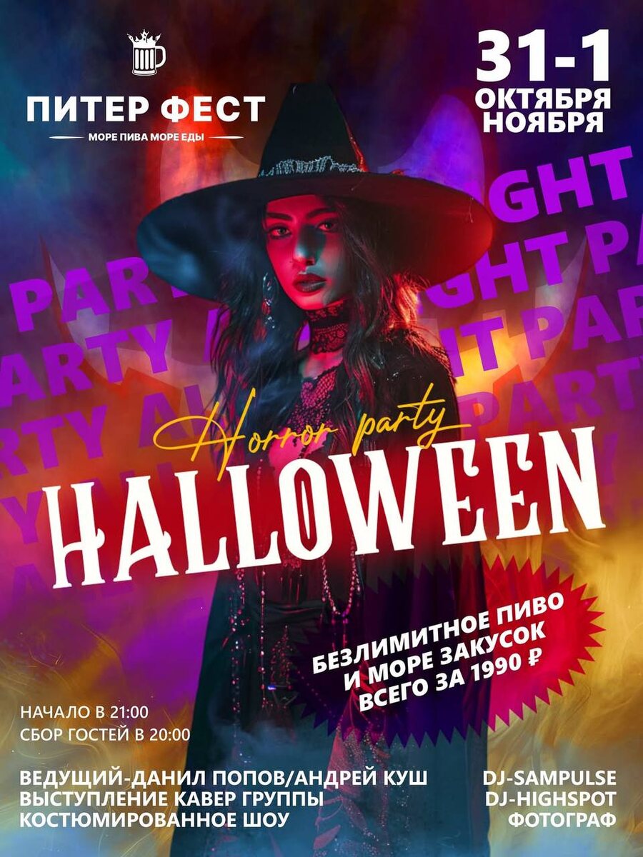 31 октября - 1 ноября «Питер Фест» превратится в эпицентр сверхъестественного веселья 🧛♂️ Что вас ждет костюмированное шоу, ведущие выступление кавер-группы, фотограф, DJ-SAMPULSE и DJ-HIGHSPOT. А также безлимитное пиво и море закусок всего за 1990 рублей 🍻 📅 31 октября — 1 ноября, начало в 21:00, сбор гостей с 20:00