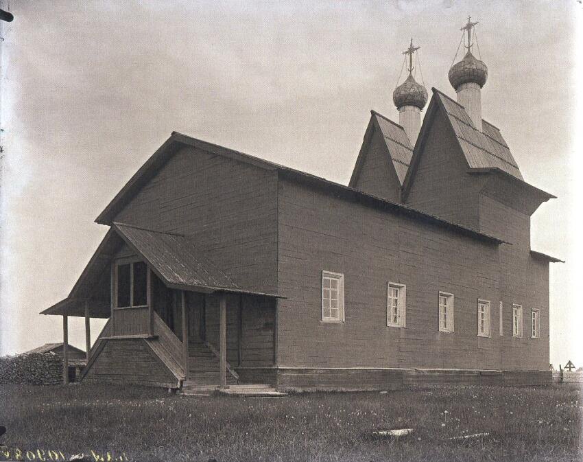 Перед вами - Церковь Введения во храм Пресвятой Богородицы в деревне Осиново Виноградовского района Архангельской области. Храм построен в 1684 году, поновлен в 1776 году. Судя по всему, утрачен в 1950-е годы. На снимке - вид на храм с юго-запада. Фотография художника В.М. Владимирова, 1913-1915 гг. Из фондов Государственного музея архитектуры (Москва). Это достаточно редкий вариант, в котором основная часть церкви, прямоугольная в плане, покрыта двумя высокими двускатными кровлями, каждая из которых увенчана главкой.
