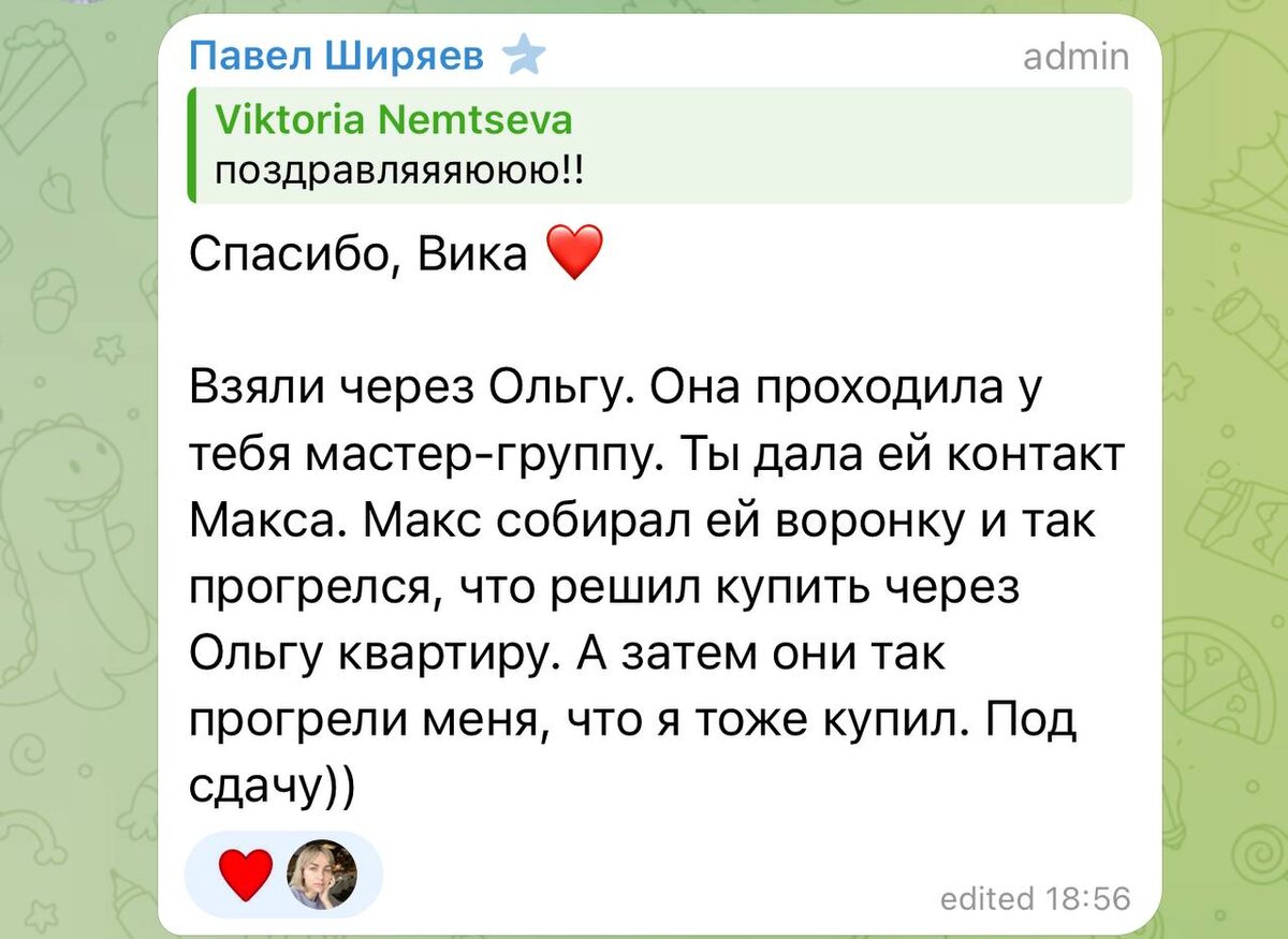 А вот это как работает Вселенная, когда ты начинаешь проявляться. Оля - агент по недвижке, проходила у меня Мастер-группу по продажам через Телеграм, и я порекомендовала ей подрядчика, чтобы он сделал ей воронку в чат-боте. Макс - подрядчик пока делал воронку, так прогрелся, что купил квартиру, а потом купил квартиру и его брат😁 Мастер-группа для Оли уже раз 20 окупилась))) она еще во время обучения 300к заработала на новых знаниях)))
