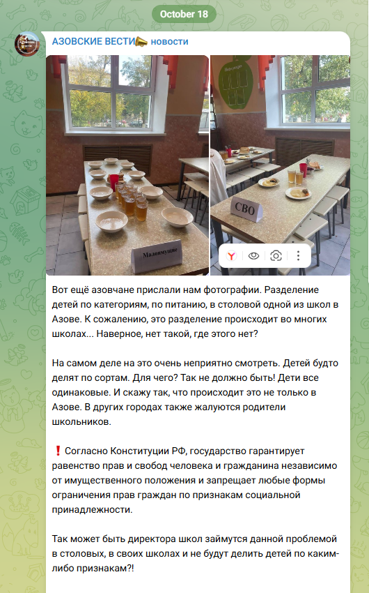 18 октября телеграм-канал «Азовские вести» опубликовал жалобу азовчан на разделение детей в одной из школ по категориям. В тарелках одних ребятишек, если верить фото, что-то похожее на кашу, в других же пюре и мясо. Да и жителей возмутил сам факт такого разделения детей «по сортам», как они написали. В комментариях люди пишут, что на снимках — школа № 11, которая действительно находится в Азове. Фотографии прокомментировала глава Лиги безопасного интернета Екатерина Мизулина, её цитату приводит телеграм-канал Новости Ростова|161.RU: «В TikTok и ряде других соцсетей распространяются фото из школы города Азова. Якобы в школе в столовой на столах установлены таблички „Малоимущие“, „СВО“. Причем, судя по фото, отличаются столы не только табличками, но и составом блюд. Если инфа достоверная, то это очевидная дискриминация. Сложно представить, насколько дискомфортно ребятам и какую травлю это может провоцировать». Сегодня ситуацию в своём официальном телеграм-канале прокомментировал губернат