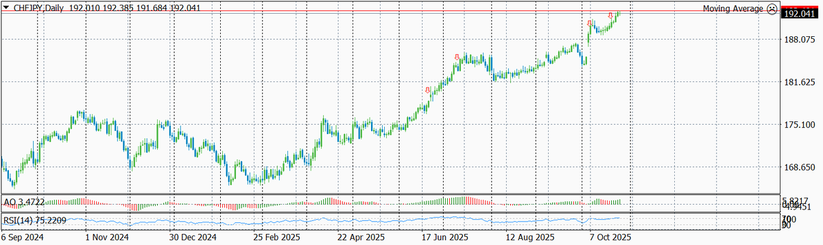 В дополнение к ранее открытым позициям от 15.07.2025, 08.10.2025 усиливаем шорт валютных пар CHF-JPY и EUR-JPY с десятым плечом от текущих уровней соответственно 192 и 178.