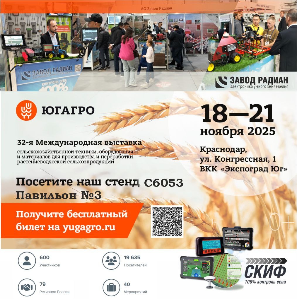 🌾 С 18 по 21 ноября АО "Завод "РАДИАН" примет участие в 32й Международной выставке сельскохозяйственной техники, оборудования и материалов ЮГАГРО 2️⃣0️⃣2️⃣5️⃣. Приглашаем Вас посетить наш выставочный стенд С6053 в 3м Павильоне выставки. 📍 Выставка будет проходить по адресу: г. Краснодар, ВКК «Экспоград Юг», ул. Конгрессная, 1 ⠀ Мы представим: ✅ Системы контроля высева «СКИФ» для широкого ряда посевной техники, в том числе: 👉 Датчик контроля нормы высева ДПФТ 👉 Датчик контроля потока семян ДПП-3 👉 Клапан перекрытия КПС для закладки техколеи 👉 Систему контроля и управления техколеёй СКИФ-38 👉Систему контроля и управления электродвигателями дозаторов СКИФ-48 👉 Систему контроля СКИФ48 для сеялки точного высева Amazone EDX. ✅Электронные датчики различного назначения и применения ✅Навигационные решения для различных с/х работ