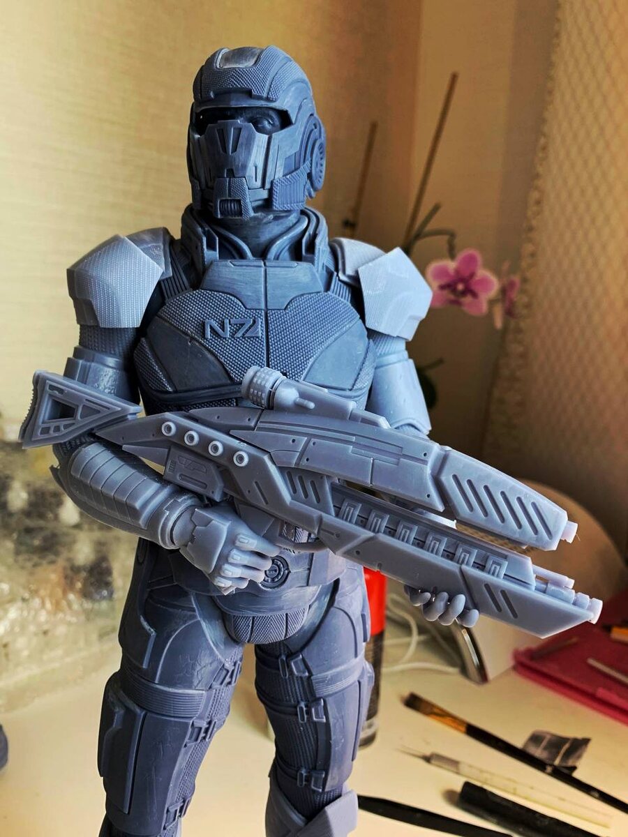 Собрали статуэтку Шепарда, ещё нужно допечатать мелкие детали. Параллельно ещё делаются Тали, Лиара и Нормандия, остался с прошлого предзаказа готовый Гаррус, так что скоро будет команда в сборе)