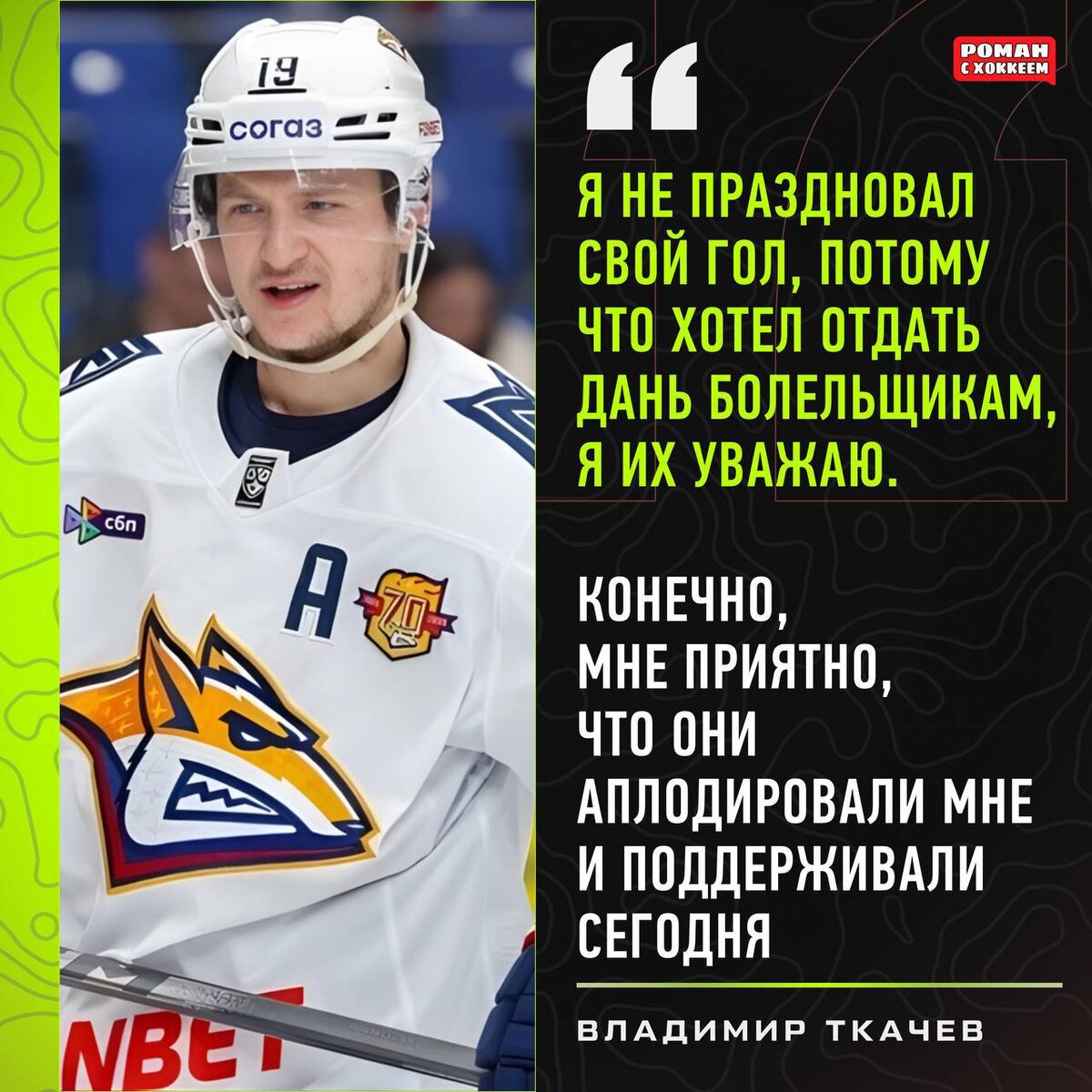 Во вчерашнем матче между «Авангардом» и «Металлургом» воспитанник омского хоккея, обменянный этим летом Владимир Ткачев забросил шайбу в ворота бывшего клуба, но не отпраздновал гол. «Я не праздновал свой гол, потому что хотел отдать дань болельщикам, я их уважаю. Конечно, мне приятно, что они аплодировали мне и поддерживали сегодня» Достойный поступок Владимира Ткачева.