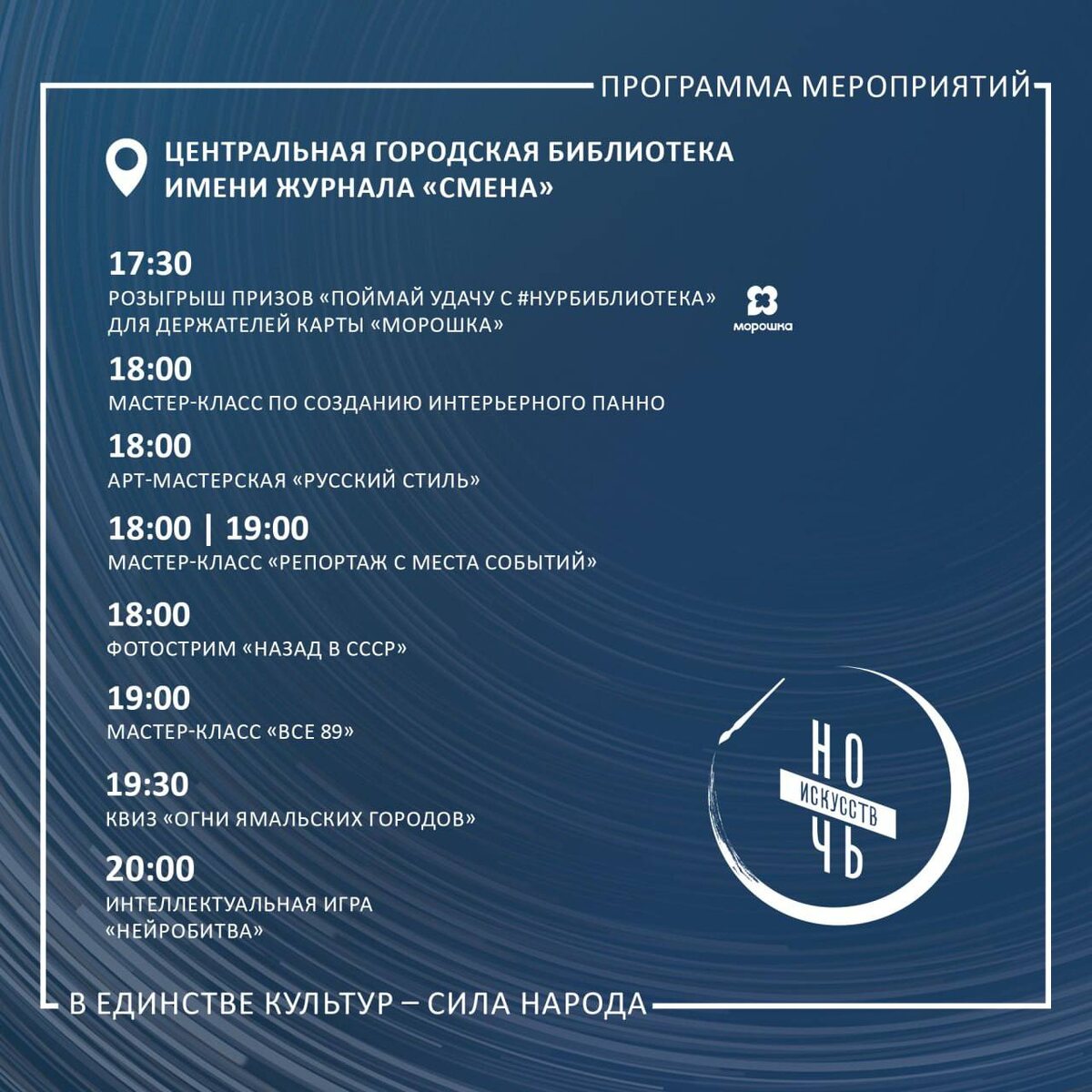 ✨ Всероссийская акция «Ночь искусств» в Новом Уренгое 3 ноября в учреждениях культуры города планируются самые различные мероприятия. Ориентируйтесь на программу в карточках и присоединяйтесь! В единстве культур — сила народа! #Юбилей_для_людей ❤️ НУР. Официально | Подписаться в MAX