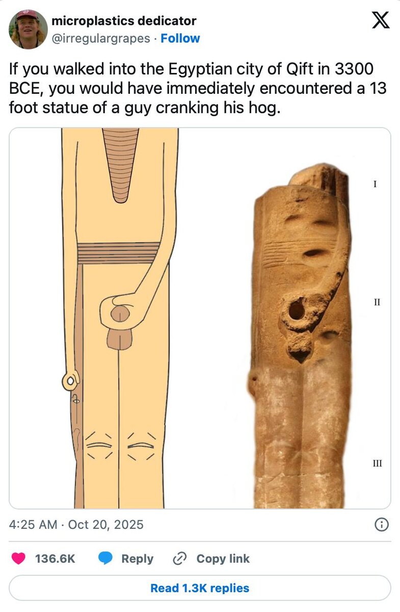Древнеегипетский бог плодородия стал звездой соцсетей благодаря своим... анатомическим особенностям. Выставка "Божественный Египет" в музее Метрополитен в Нью-Йорке привлекает внимание посетителей не только богатой коллекцией древнеегипетских артефактов, но и одним весьма пикантным экспонатом. Речь идет о Колоссальной статуе Мина — древнеегипетского бога плодородия, возраст которой превышает 5000 лет. Статуя изображает божество в весьма откровенной позе, что и стало причиной ее вирусной популярности в социальных сетях. Изначально рост статуи составлял около 2,6 метра, но сейчас она "уменьшилась" до 1,77 метра. Самая интригующая деталь: согласно исследователям музея, оригинальный фаллос был отдельно вырезанной съемной деталью, которая затерялась во времени. Возможно, ее украли — древние египтяне верили, что порошок из священных статуй может передать их божественную силу. Статуя Мина является частью масштабной экспозиции, включающей почти 250 объектов, некоторые из которых предоставлены