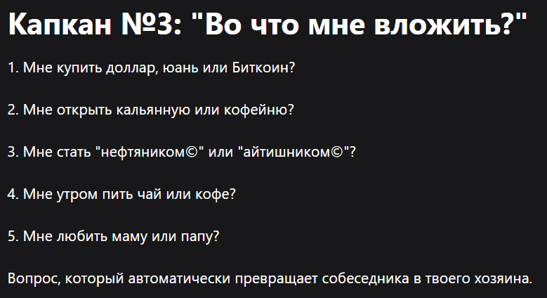 1. Мне купить доллар, юань или Биткоин? 2. Мне открыть кальянную или кофейню? 3. Мне стать "нефтяником©" или "айтишником©"? 4. Мне утром пить чай или кофе? 5. Мне любить маму или папу? Вопрос, который автоматически превращает собеседника в твоего хозяина. Ты стал пассажиром чужого автобуса, который может ехать в сторону, где тебе не нравится. Где ты ничего не понимаешь. А потом удивляемся, что деньги, время и силы оказались не там, где хотели. Эксперт обязательно тебе подскажет, что выгоднее. Для него. (https://t.me/rocknnomics/26) Исцеление, которое не хотят слышать: Есть только один выгодный метод - свой удобный. Прекращаем искать святой Грааль. Создаём свой. Маленький, кривой, но свой. Составь стратегию на месяц и проверь, что сработало. Не спрашивай разрешения, не согласовывай - учись и проверяй. Гипотеза - Проверка - Анализ - Итоги. И по новой. Доедет куда нужно только тот, кто держит руль. Построить свою сеть доходов из любой точки: https://t.me/ILYA_Z_Private/139