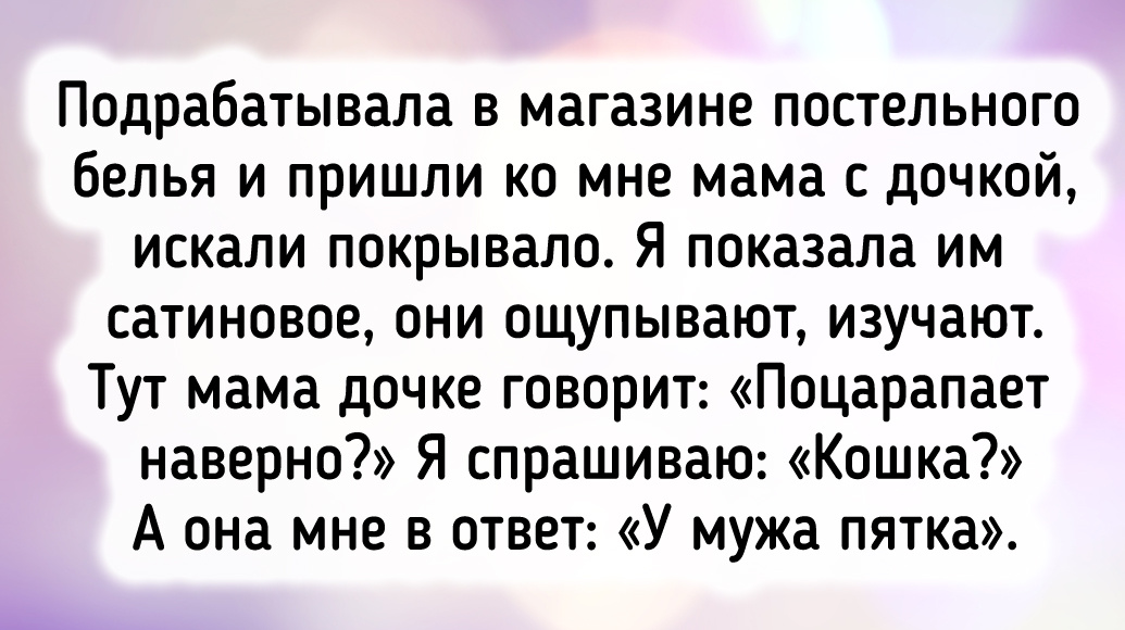 Те, кто хоть недолго занимался продажами, подтвердят, что эта работа — кладезь увлекательных историй. То клиенты приходят со странными просьбами и предложениями, то коллеги попадаются с приветом, а порой и сам уже не замечаешь, как чудить начинаешь. Я работаю кассиром уже много лет и повидала всякое. Хуже всего было, когда покупатель орал на меня и даже пожаловался моему менеджеру, а все из-за того, что я положила перец в пакет с яблоками. Он кричал, обзывал меня глупой и говорил, мол, неудивительно, что я работаю в магазине! А я, между прочим, простая студентка. Он, кстати, кроме яблок и перца, ничего тогда не купил. Когда-то работала в торговле. И вот еду один раз на работу на метро. Следующая станция моя. И тут я почему-то беру и хлопаю по спине впереди стоящего мужчину и спрашиваю, не задумываясь: «Вам что-нибудь подсказать?» © Подслушано / Ideer На работе я должен ходить в голубой рубашке и черных брюках, классика жанра. Однажды коллега попросил сходить с ним после работы в автоса